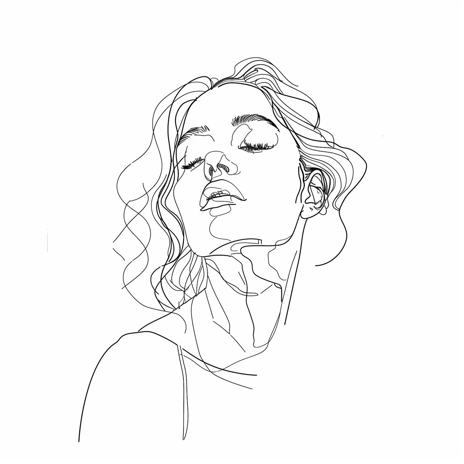 Minimalist line art of a woman with closed eyes and wavy hair, exuding serenity and elegance in a simple, fluid style.