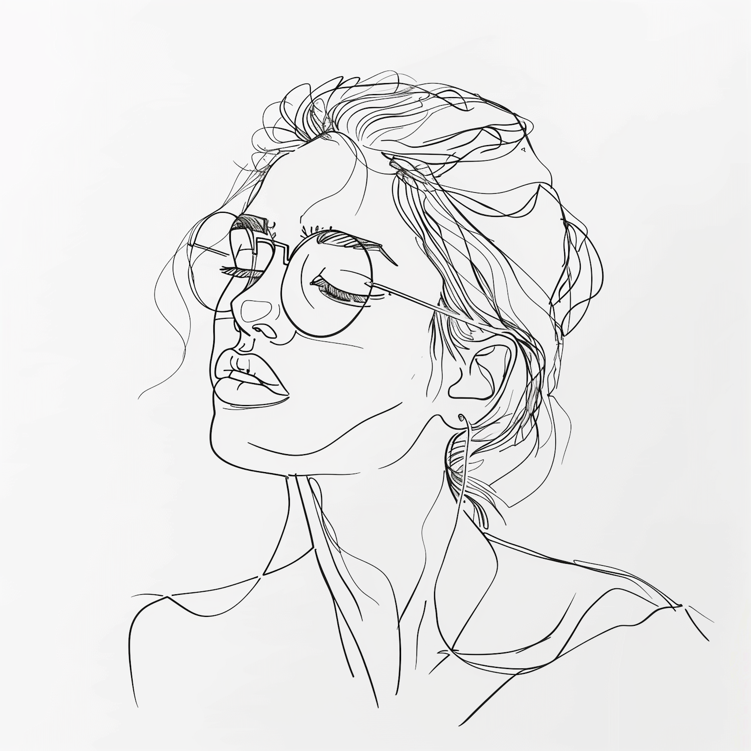 Minimalist line drawing of a woman with glasses, eyes closed, and hair pulled back, capturing a serene expression.