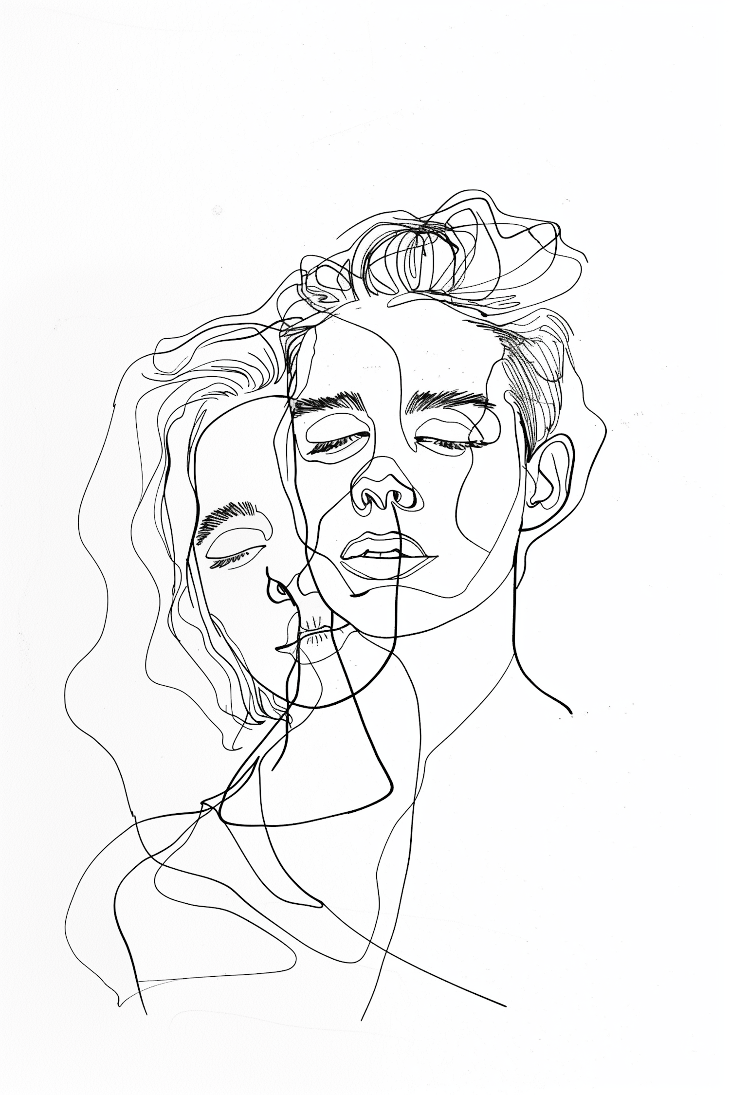 Minimalist line drawing of two overlapping faces with closed eyes, conveying calm and connection. Fluid lines create a sense of unity.