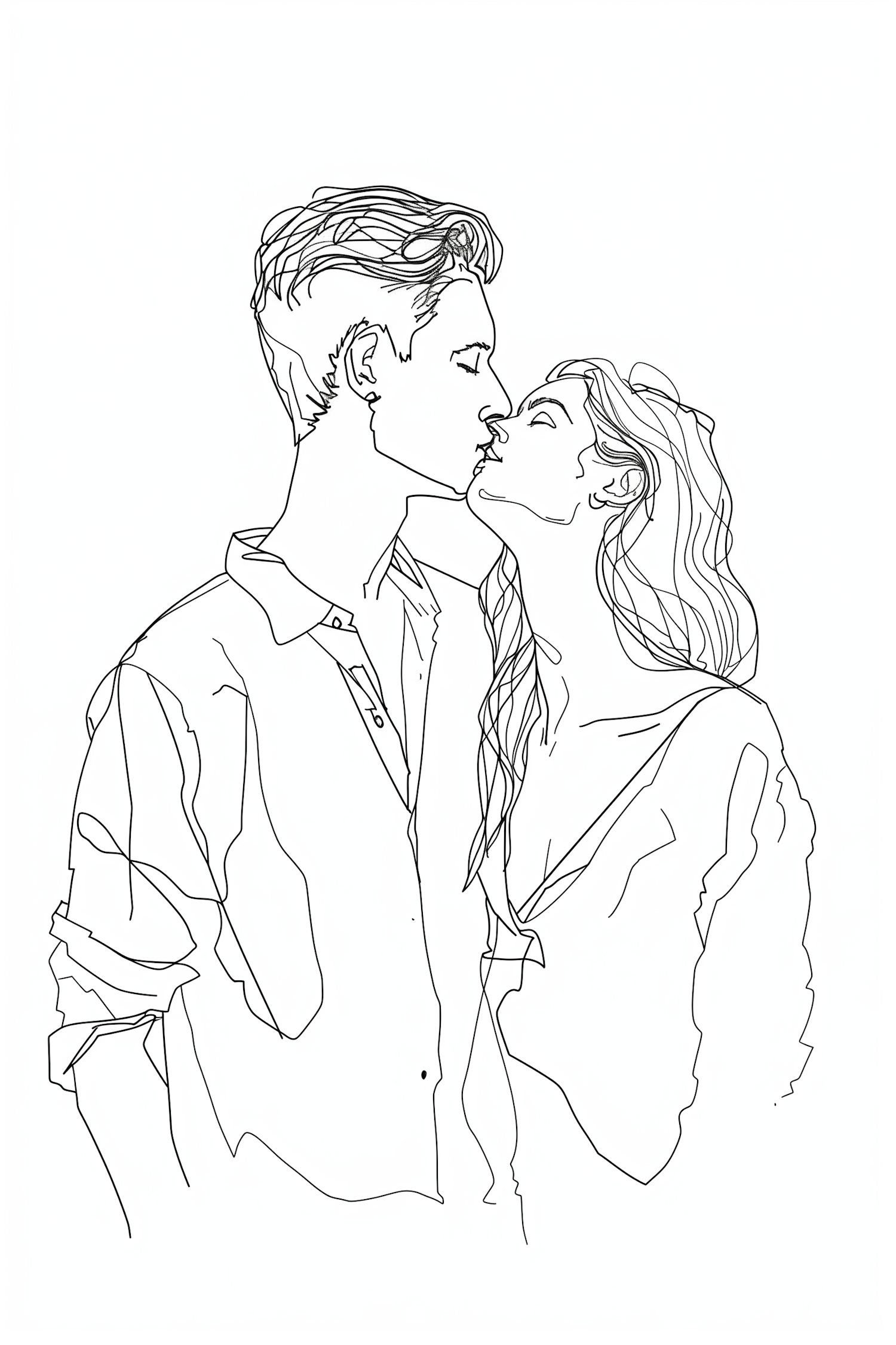 Minimalist line art of a couple sharing a romantic kiss, emphasizing intimacy and simplicity with clean, flowing lines.