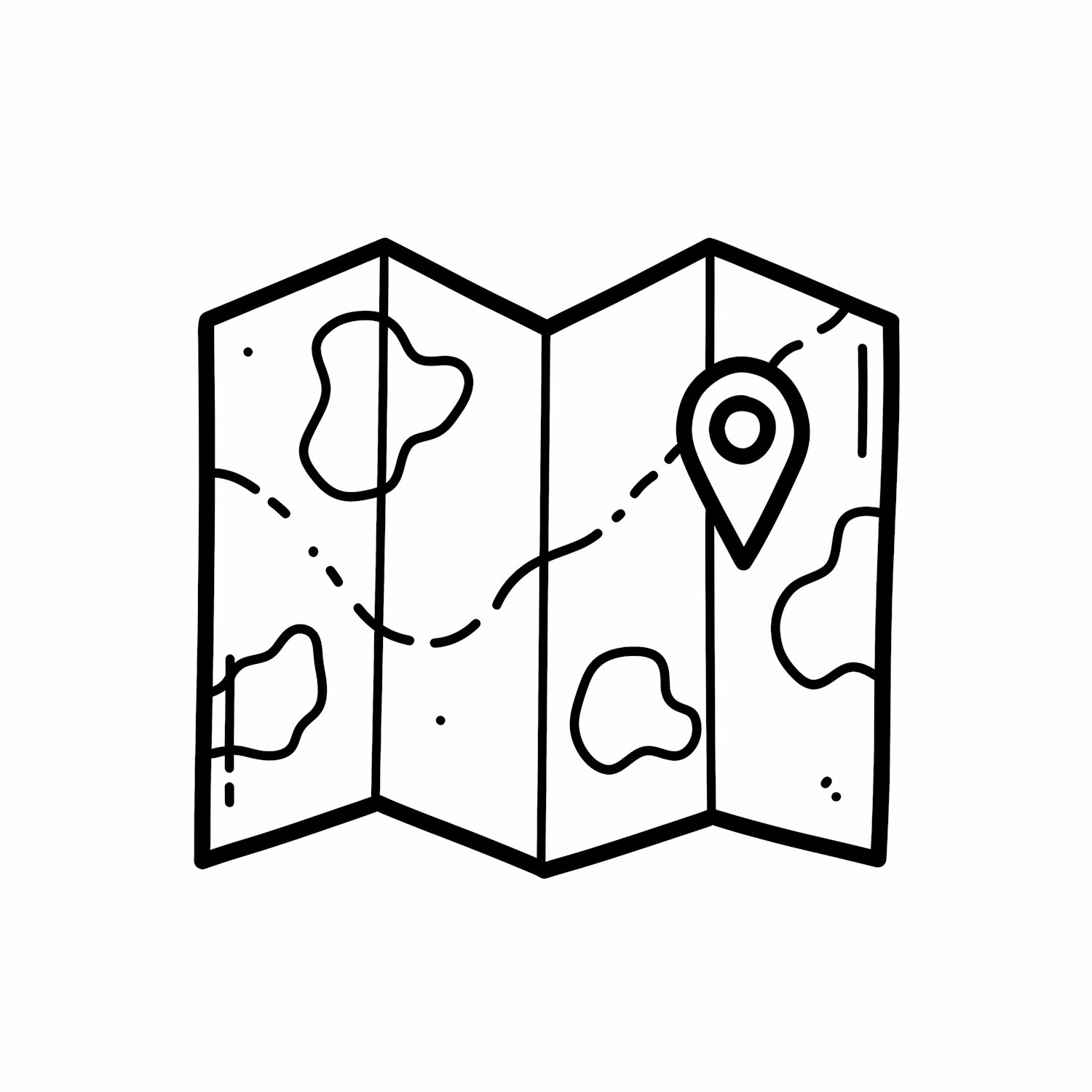 Minimalistic black-and-white illustration of a folded map with a location pin and dashed paths, perfect for navigation themes.
