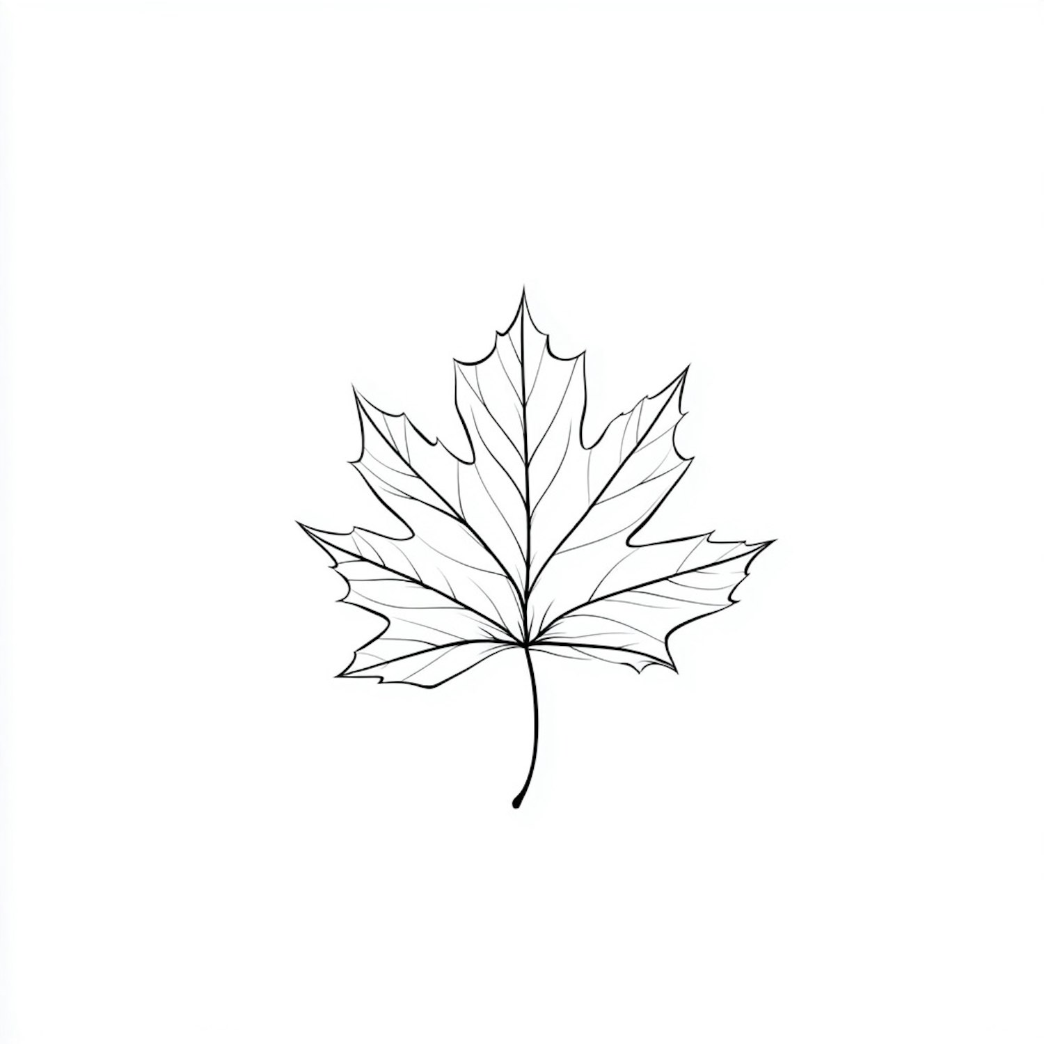 Minimalist black-and-white line art of a maple leaf with detailed veins and jagged edges on a plain white background.