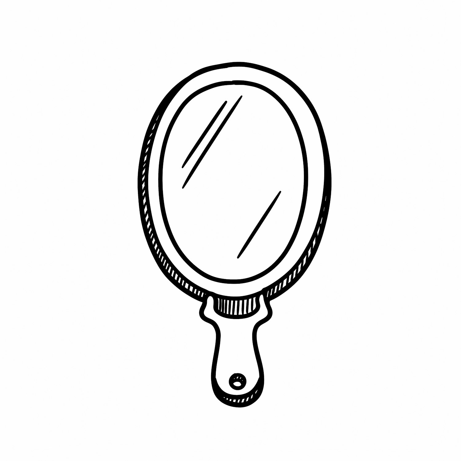 A simple black-and-white line drawing of a handheld mirror with an oval frame and a handle, perfect for design projects.