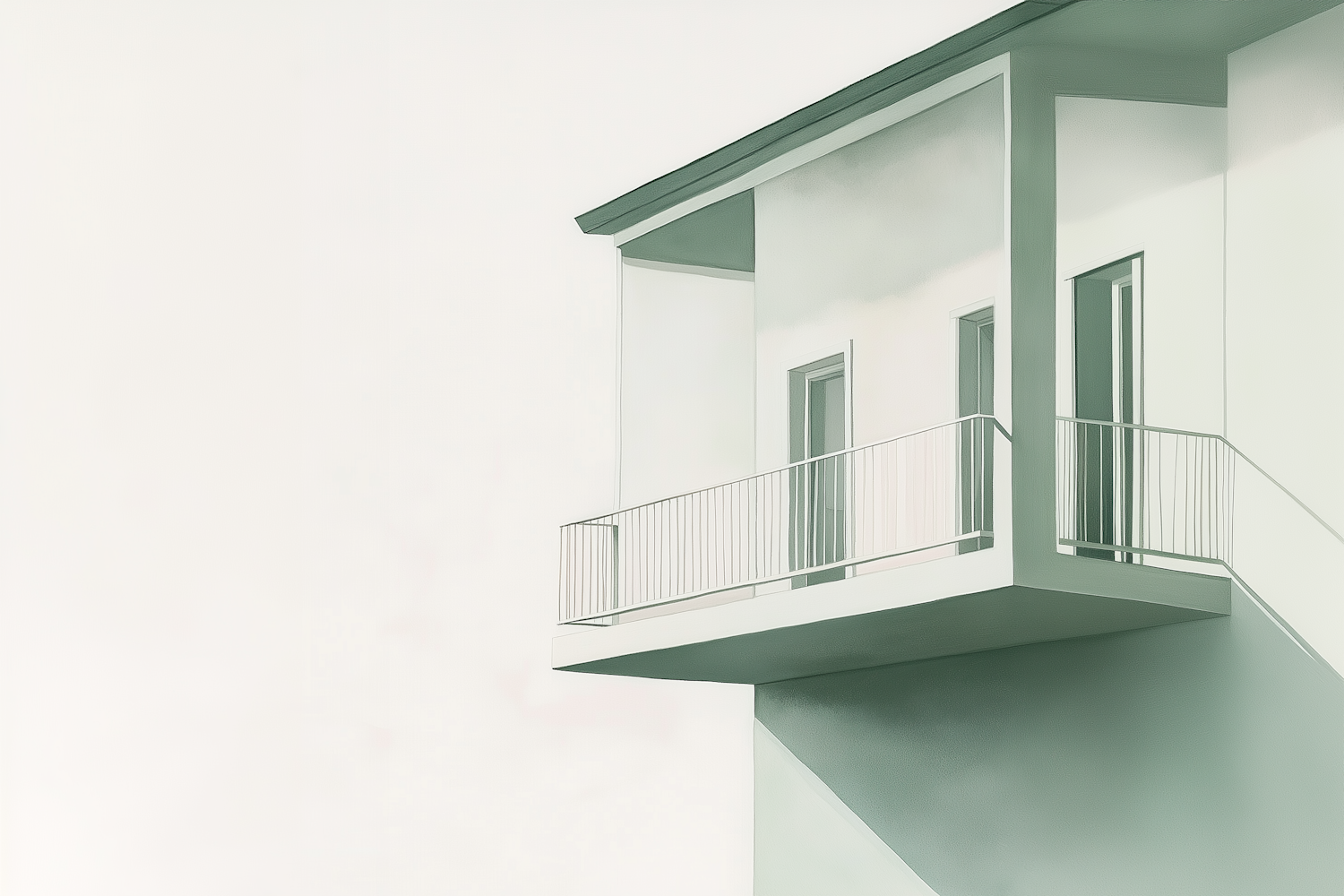 Minimalist illustration of a modern building with a balcony, featuring soft white and green tones and clean geometric lines.