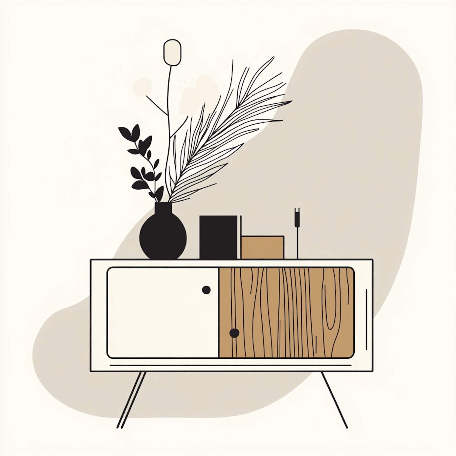 Minimalist illustration of a mid-century modern sideboard with a vase and books, featuring a sleek design and neutral colors.