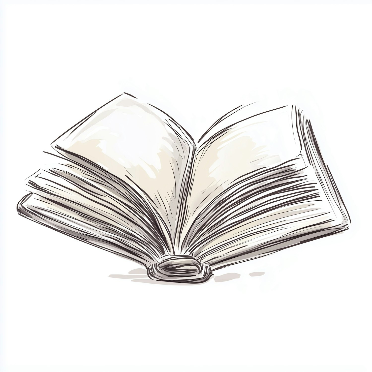 A simple sketch-style illustration of an open book with curved pages on a white background, perfect for literary or educational themes.