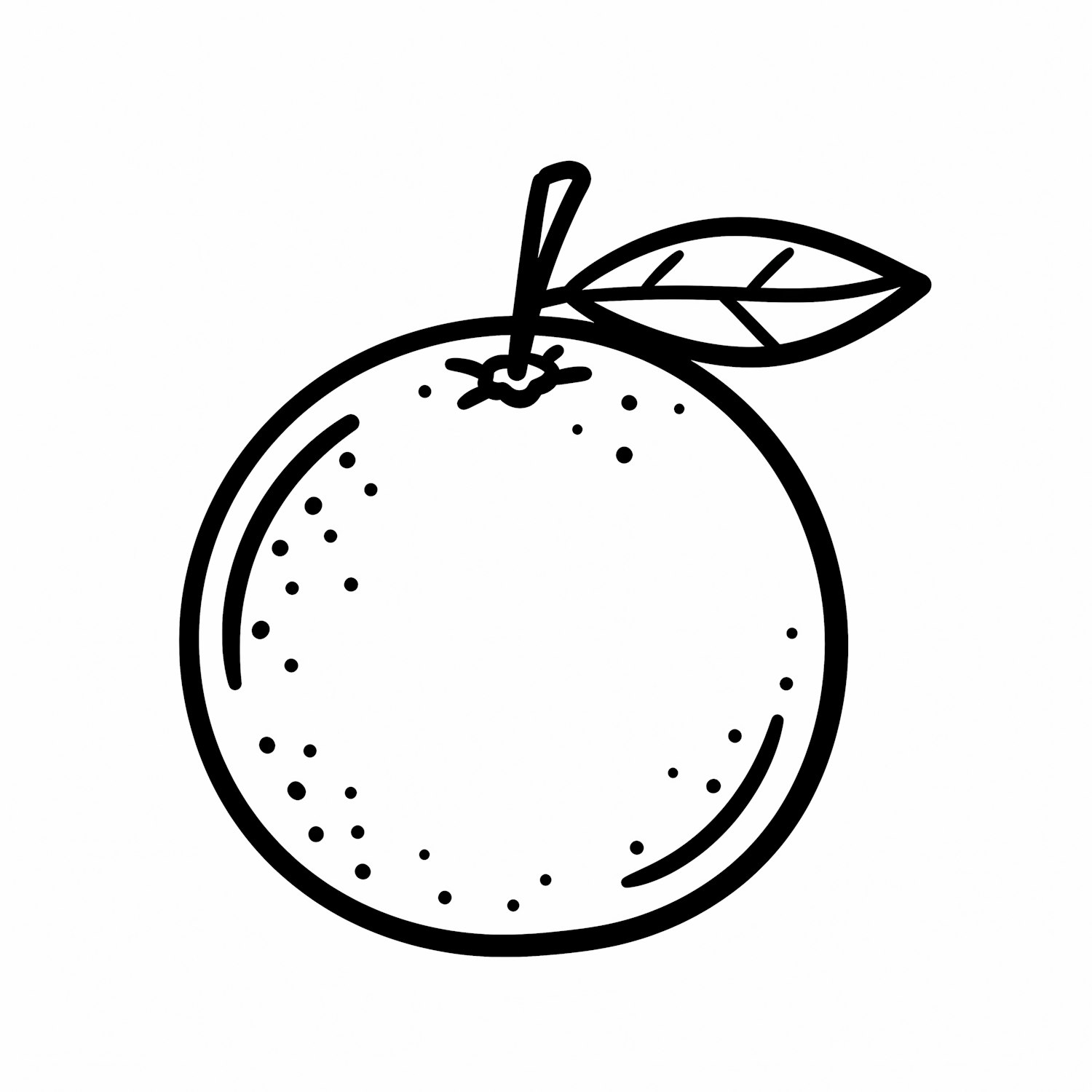 Minimalistic black-and-white line drawing of an orange with a leaf, showcasing clean lines and a simple design.