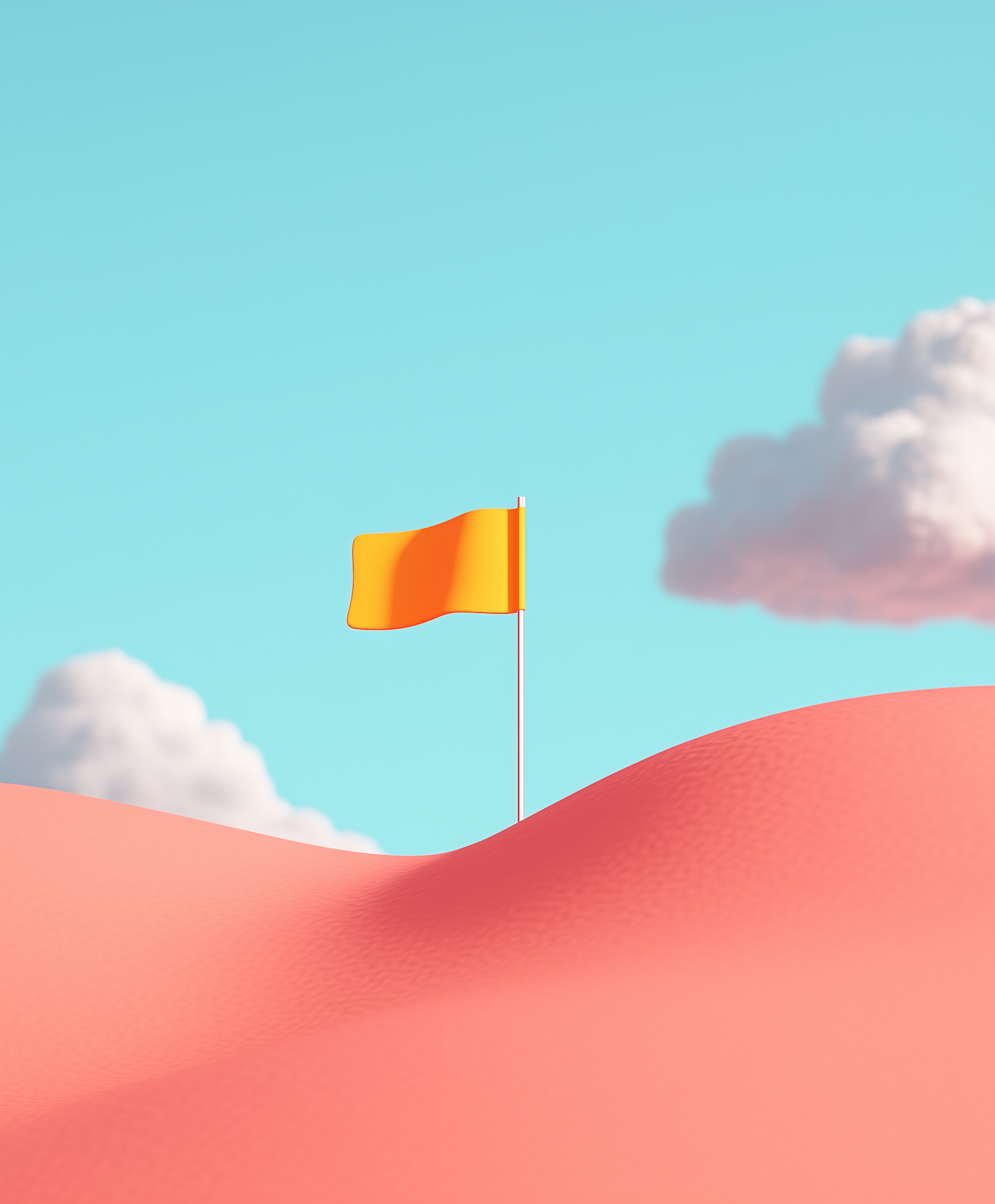 Bright orange flag on a pink sand dune under a clear blue sky with fluffy clouds. Minimalistic and vibrant scene.