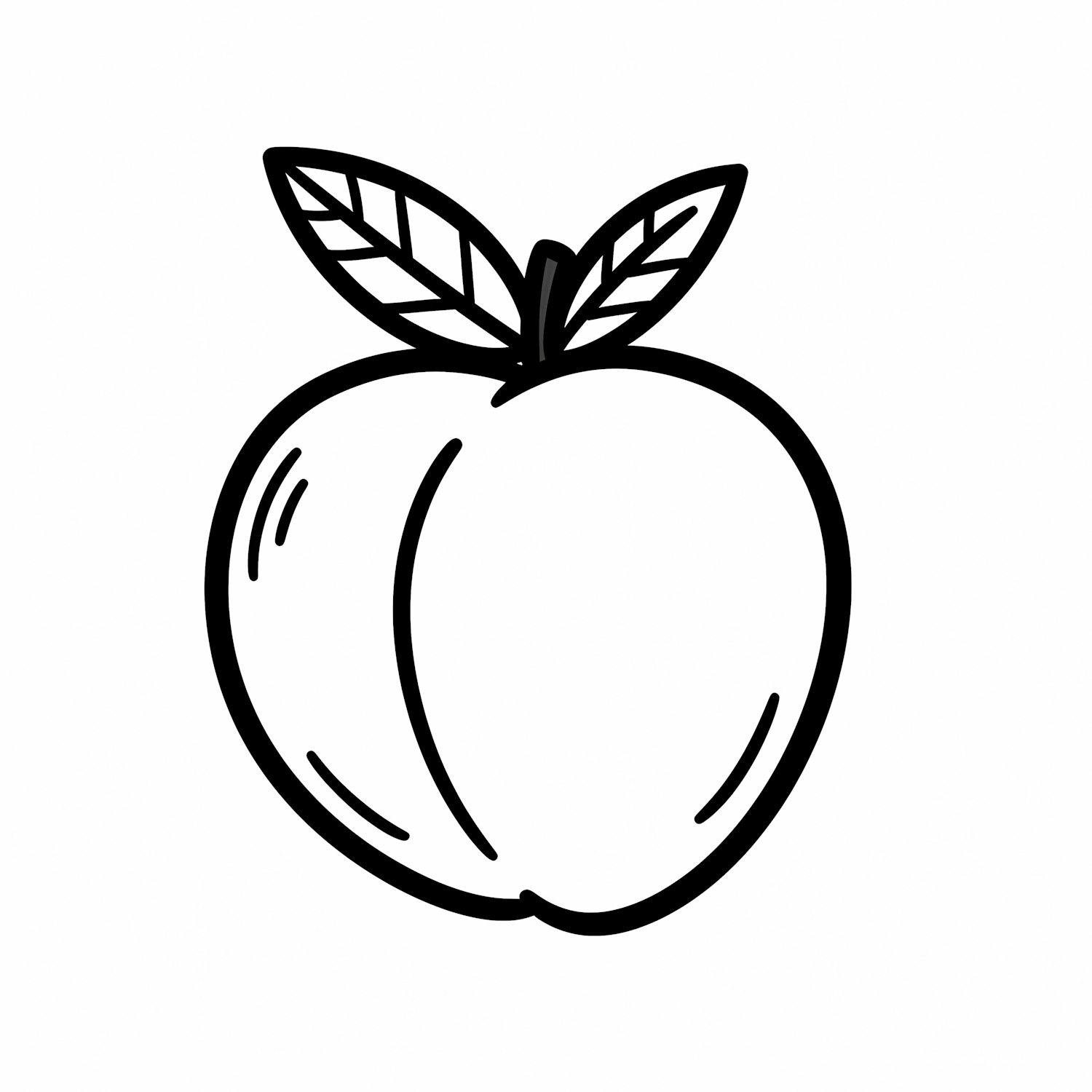Minimalistic black-and-white line art of a peach with detailed leaves, perfect for coloring or graphic design projects.