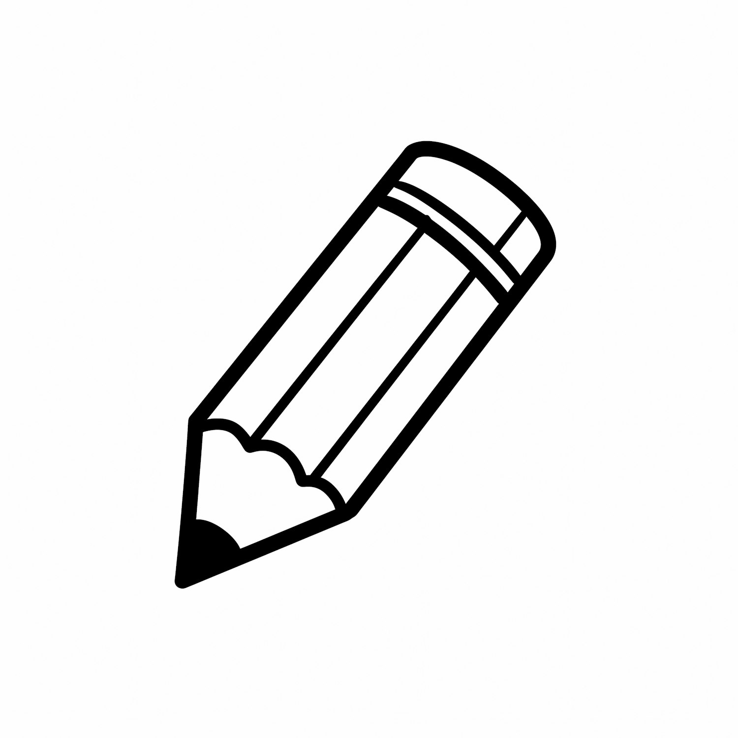 Minimalistic black-and-white line drawing of a pencil with a sharpened tip and eraser, set against a plain white background.