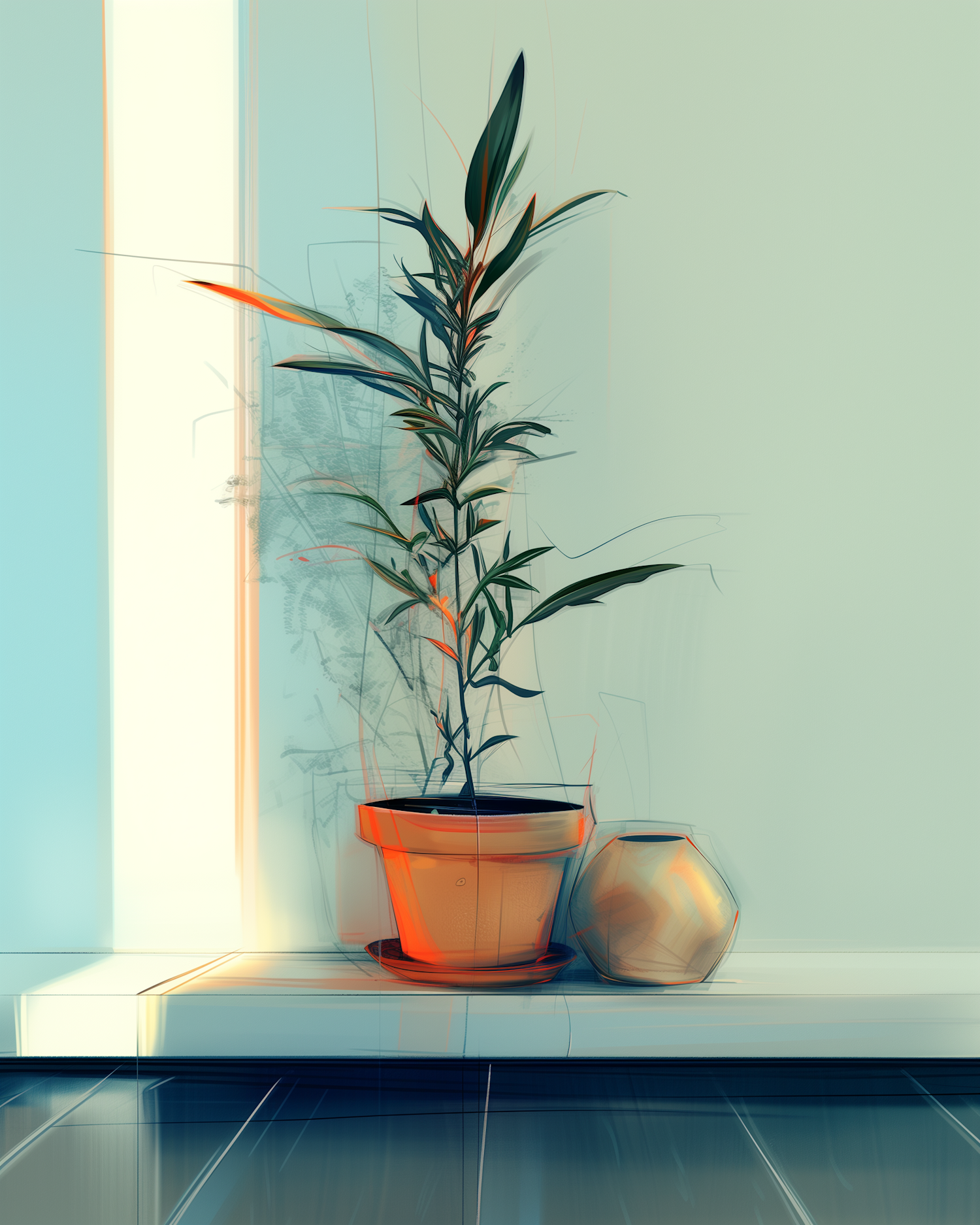 Stylized illustration of a potted plant on a shelf with a geometric vase, set against a soft green background with warm lighting.