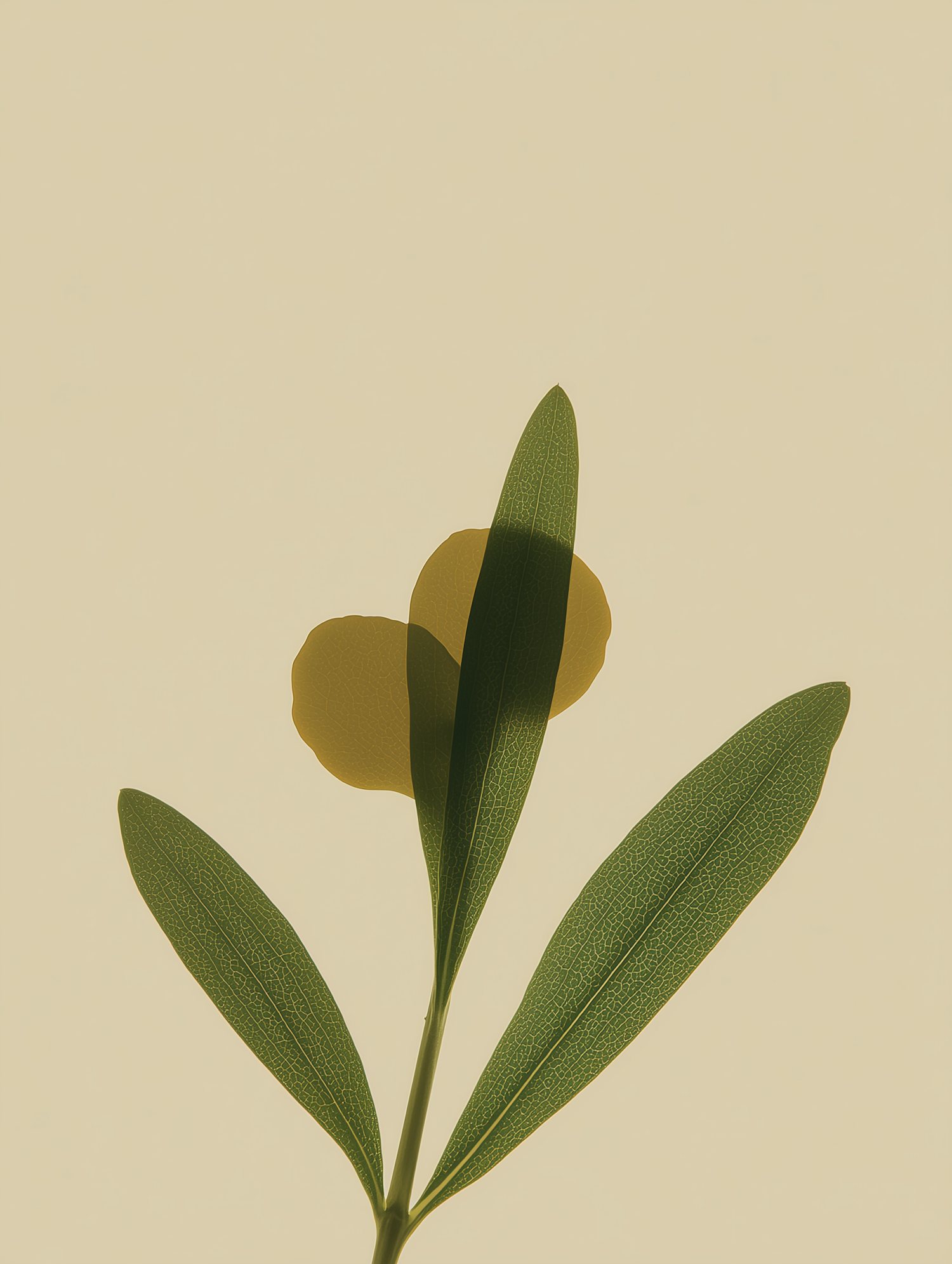 Minimalist plant composition with green leaves and abstract shapes on a beige background, showcasing natural textures and light play.