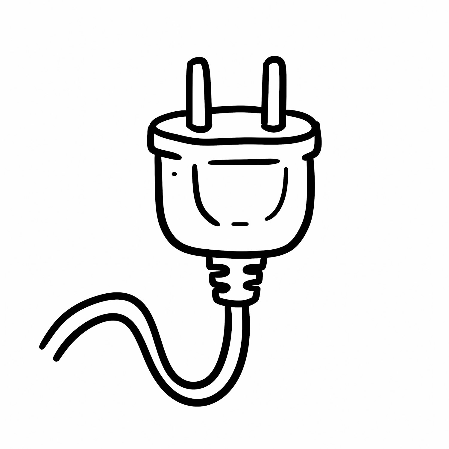 Minimalistic black-and-white line drawing of an electrical plug with two prongs and a cord, showcasing a clean and simple design.