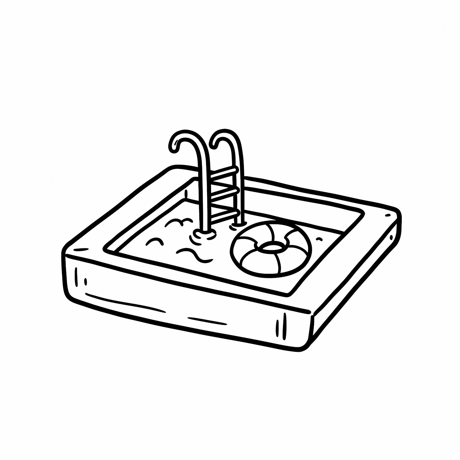 Minimalistic black-and-white illustration of a swimming pool with a ladder and a floating life ring, drawn in a clean, cartoonish style.