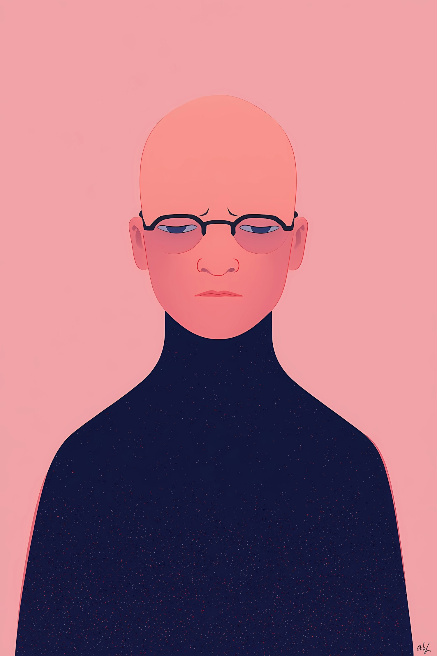 Minimalist illustration of a bald individual with glasses, wearing a dark outfit against a pink background, evoking a contemplative mood.