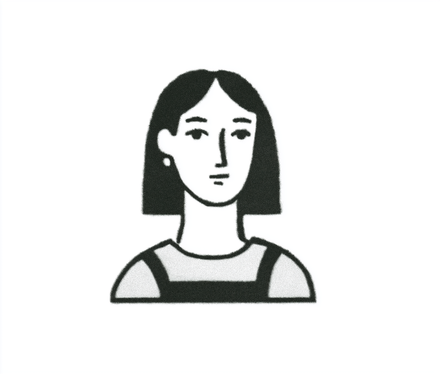 Minimalist black-and-white illustration of a person with medium-length hair and a neutral expression, wearing a simple top with straps.