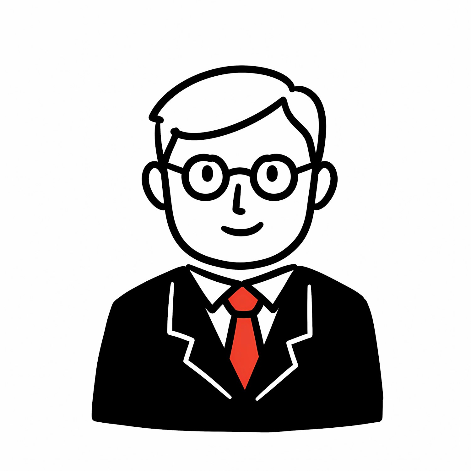 Minimalistic illustration of a person in a suit with glasses and a red tie, featuring bold lines and a clean design.