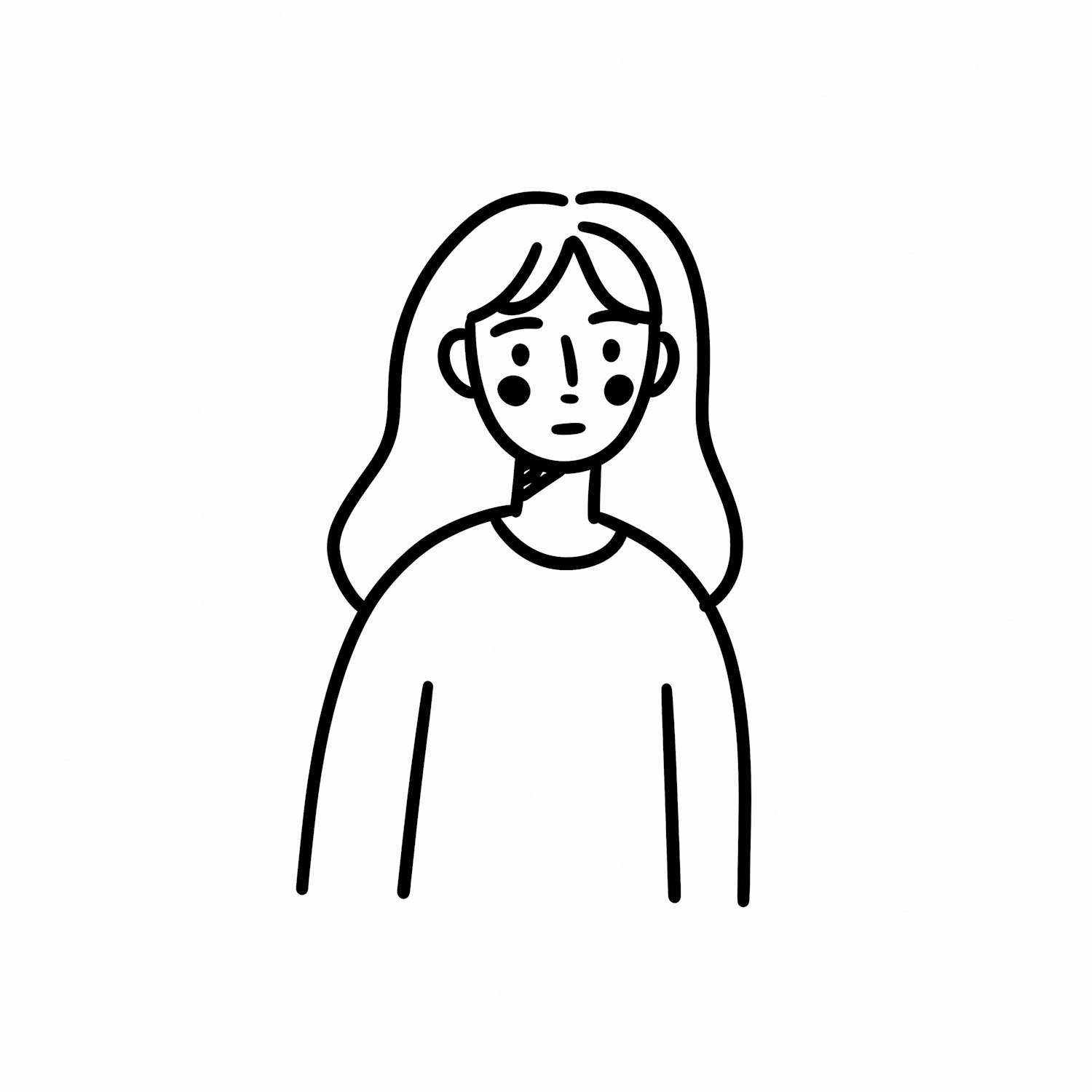 Minimalistic black-and-white line art of a person with long hair and a plain shirt, featuring clean lines and a simple design.