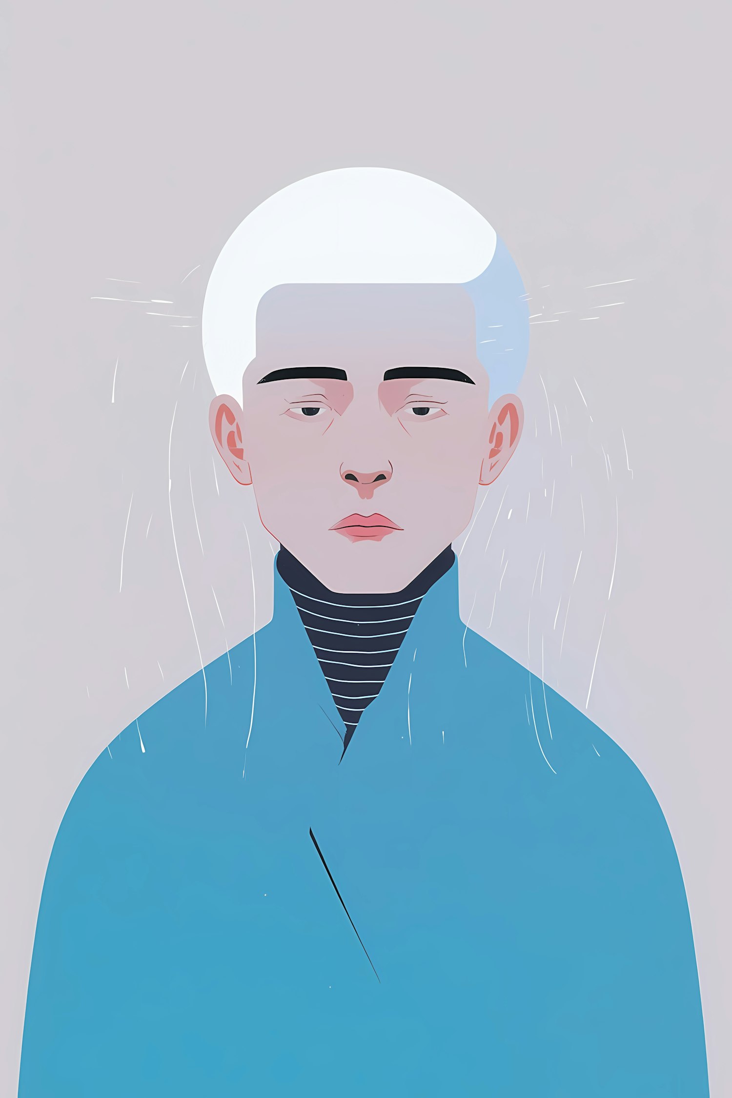Stylized portrait of a person with white hair and a blue outfit, set against a muted gray background, showcasing a minimalist aesthetic.