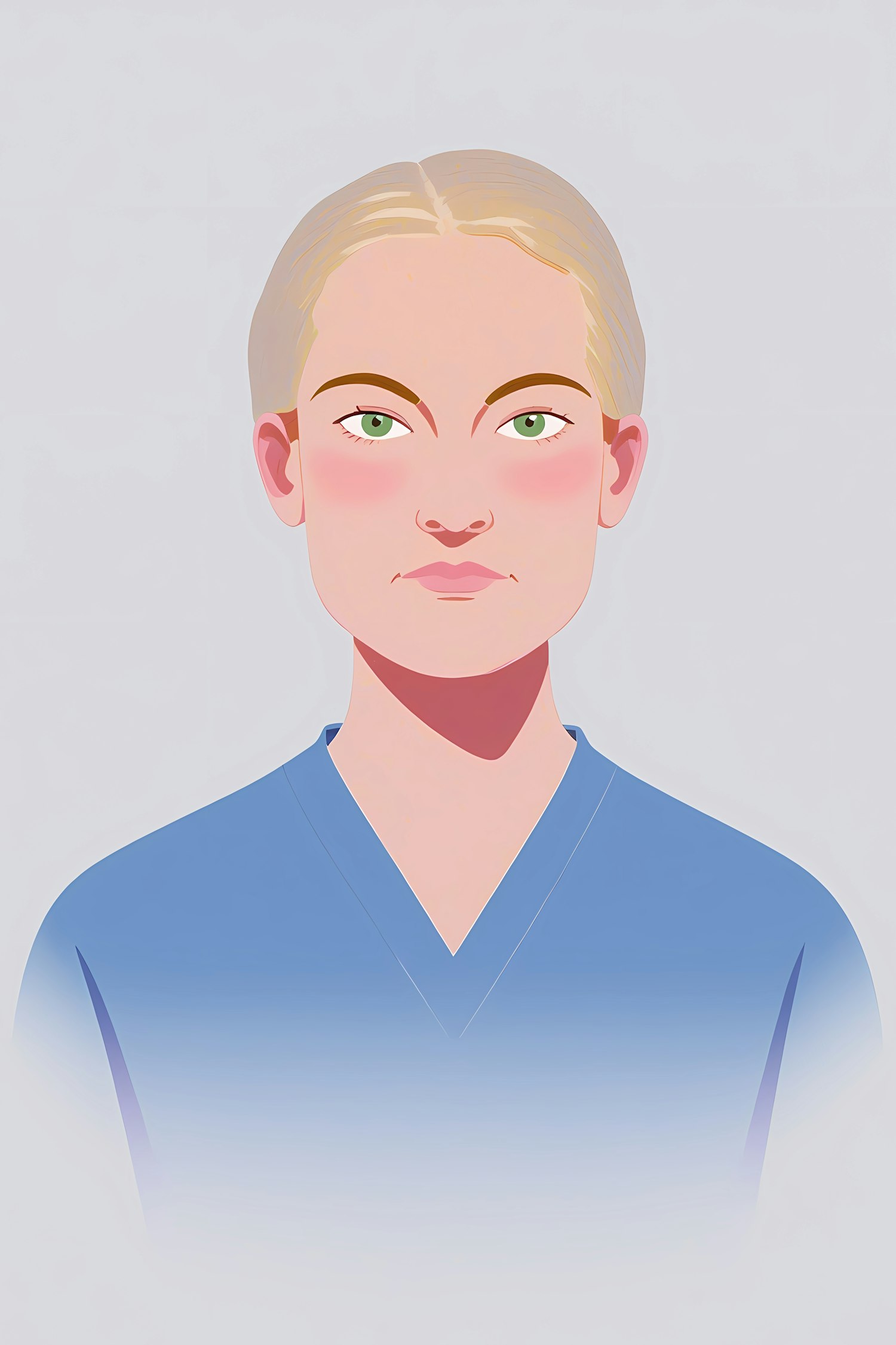 Minimalistic digital illustration of a person with blonde hair and green eyes, wearing a blue top against a soft gray background.