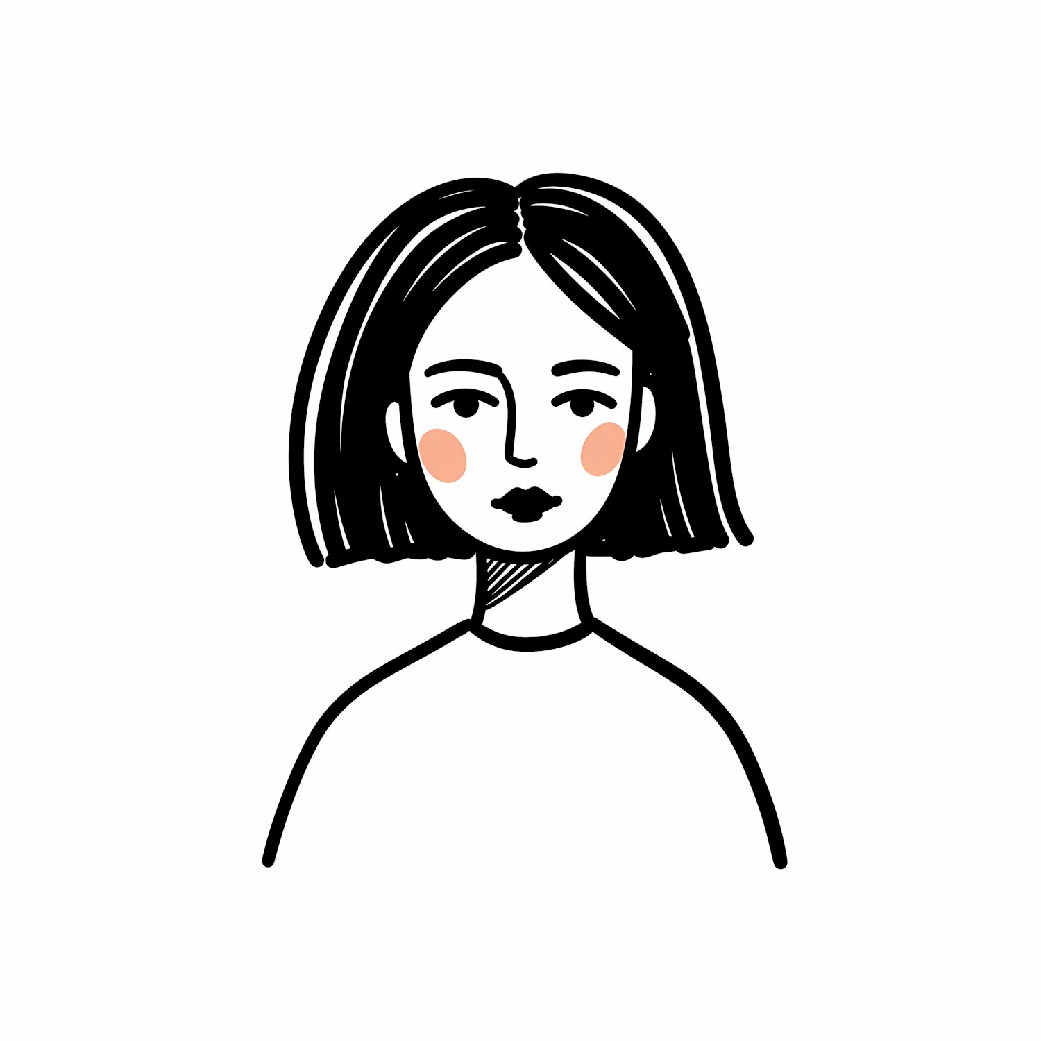 Minimalist illustration of a person with a bob haircut, neutral expression, and blush marks on cheeks, drawn in a clean, modern style.