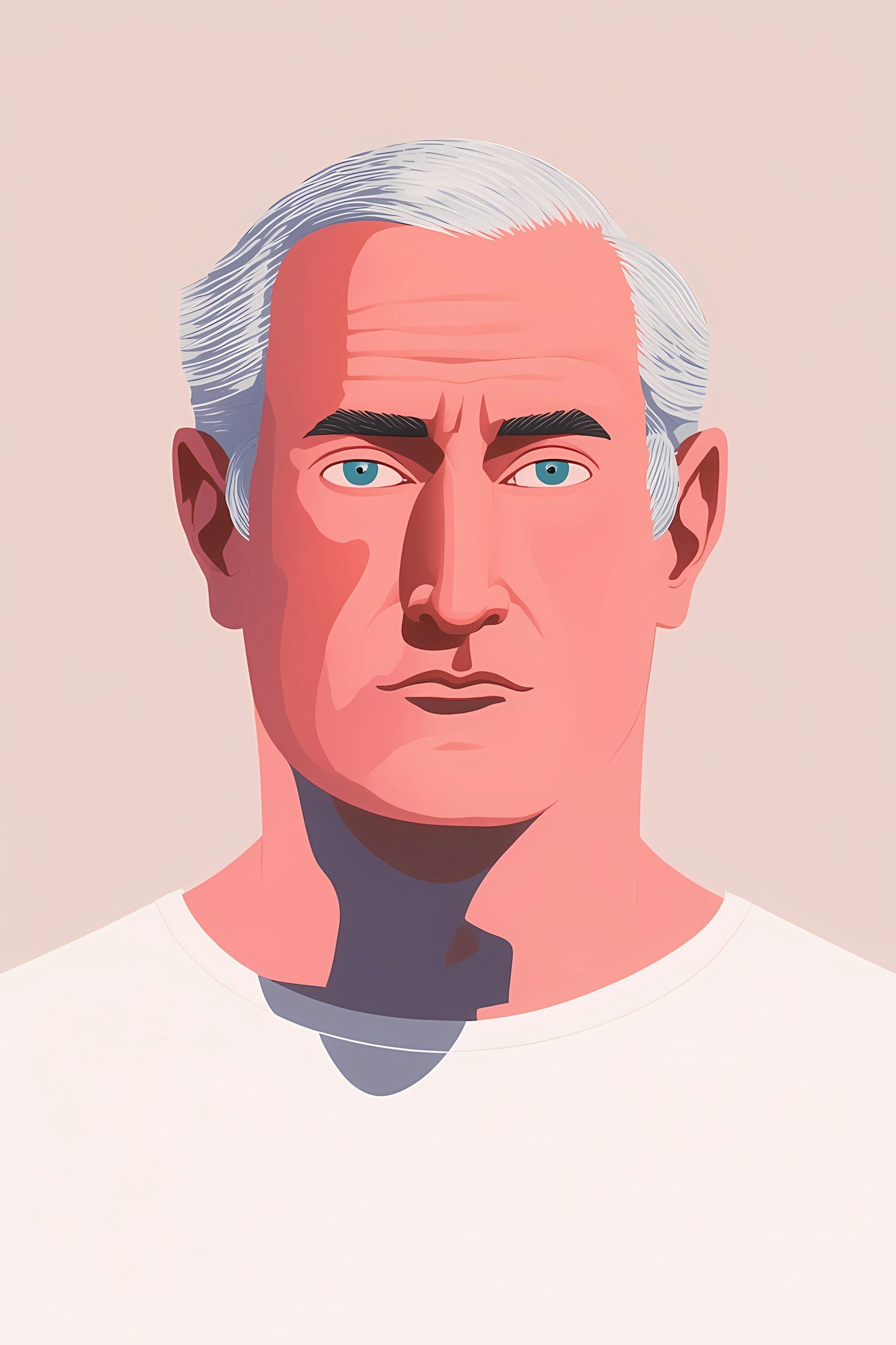 Stylized illustration of a man with white hair and blue eyes, featuring clean lines and bold shadows on a pastel background.