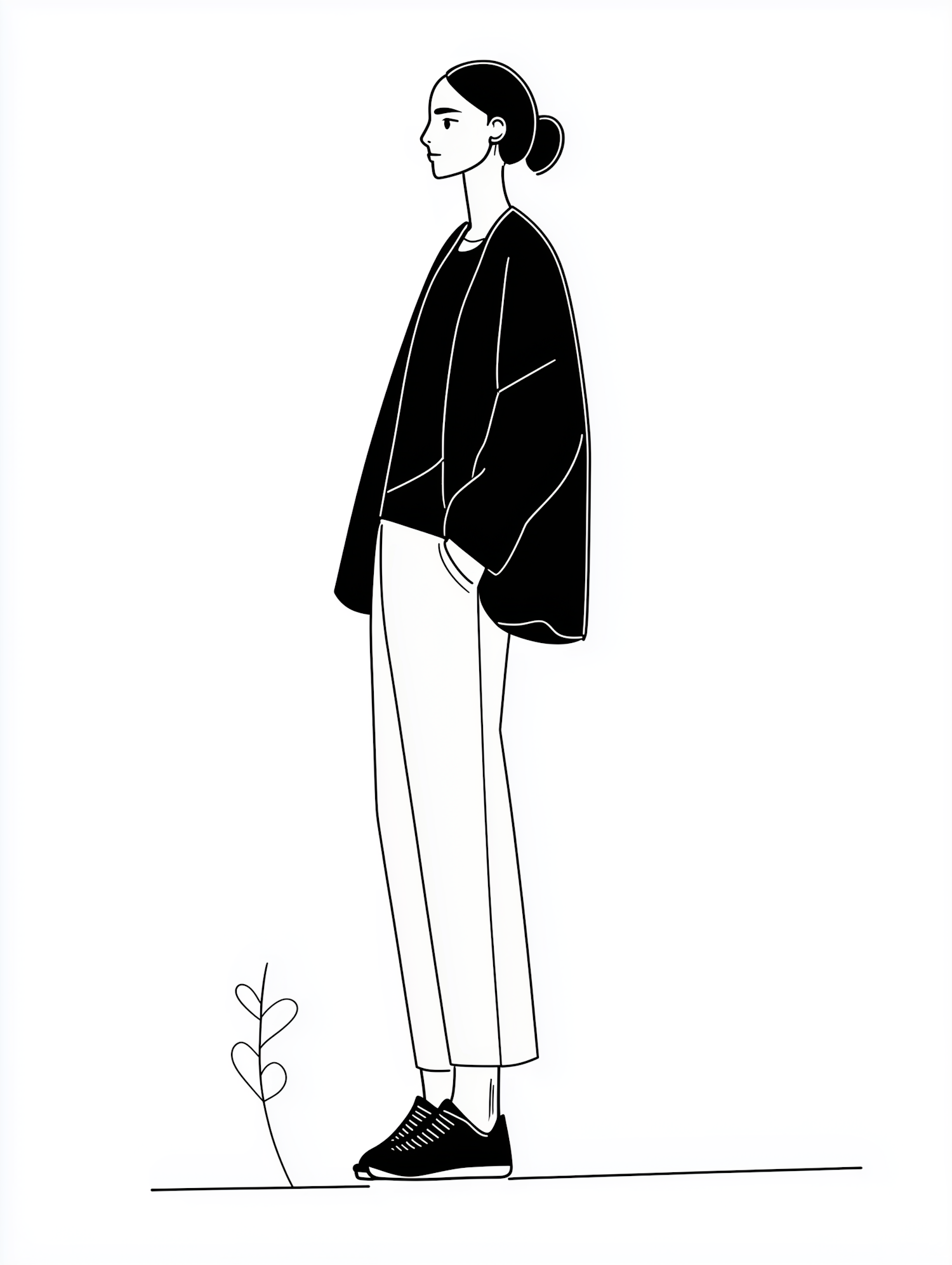 Minimalist black and white illustration of a person in a stylish outfit, featuring a loose jacket and neat bun, with a small plant nearby.