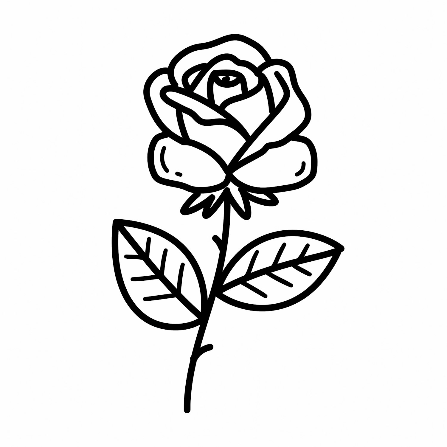 Minimalistic black-and-white line drawing of a rose with a stem, two leaves, and a blooming flower, perfect for coloring or design.