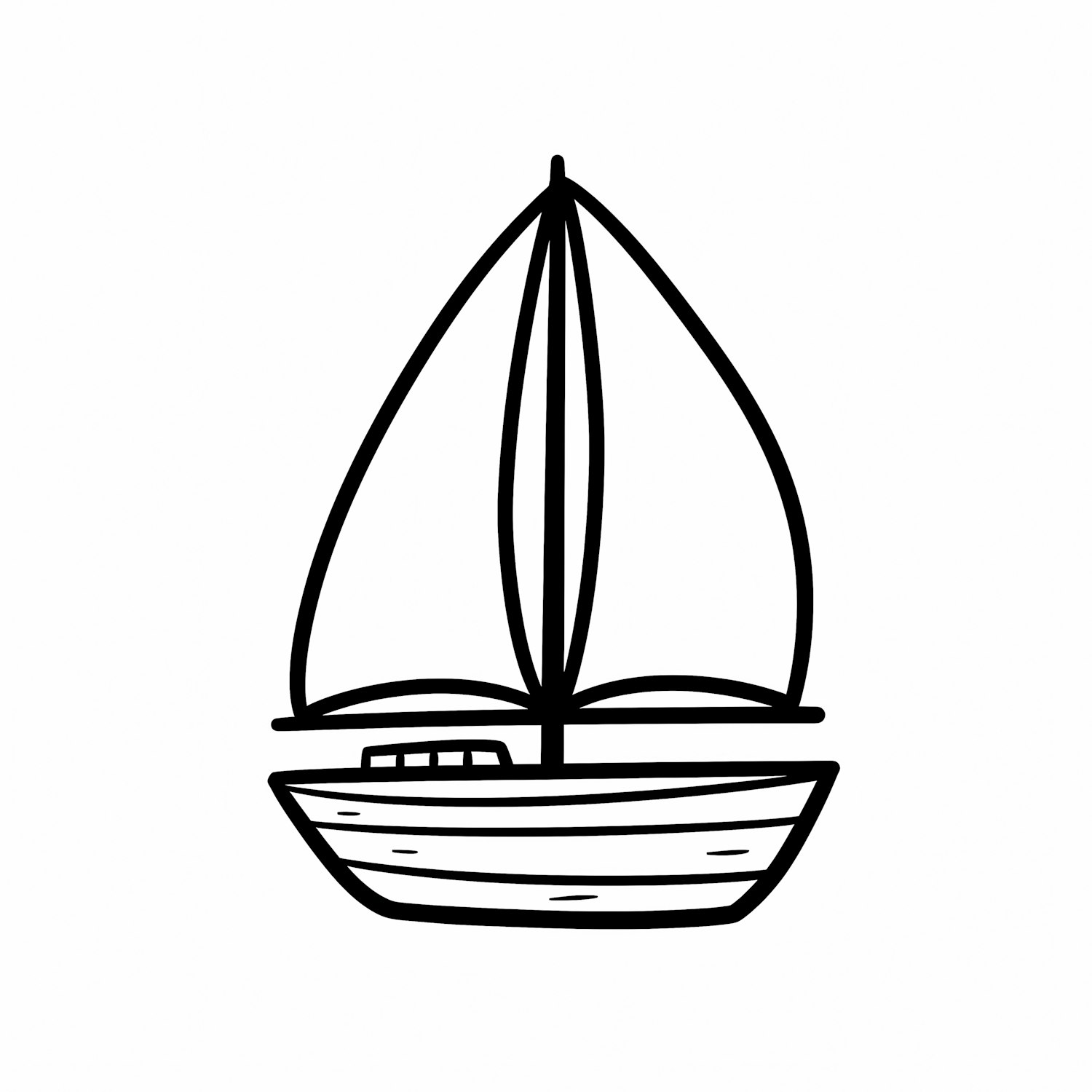 Minimalistic black-and-white line drawing of a sailboat with a triangular sail and a small cabin, set against a plain white background.