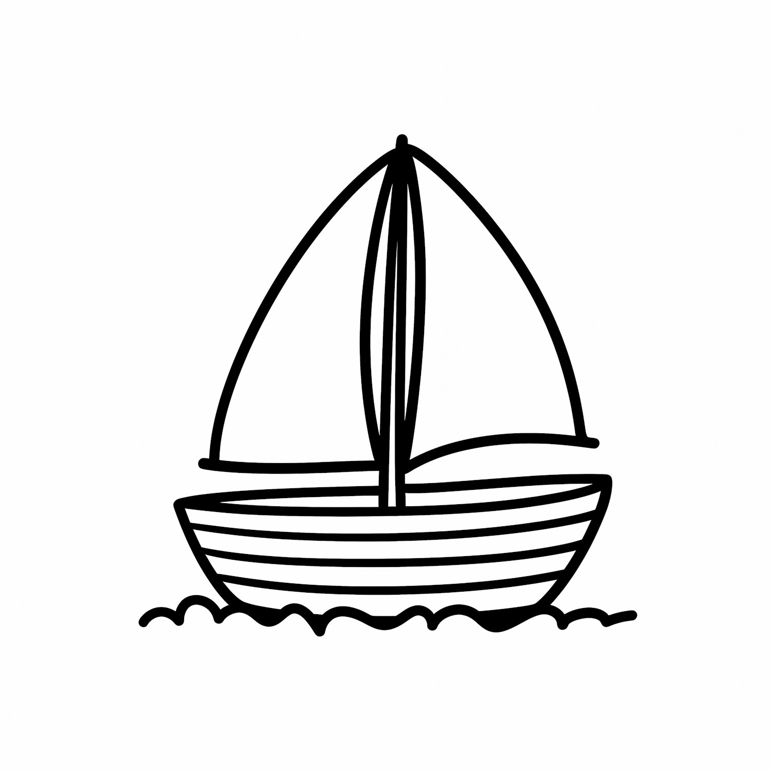 Minimalist black-and-white line drawing of a sailboat with striped hull and two sails, floating on wavy water.