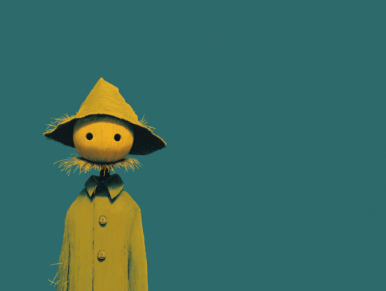 Minimalist illustration of a scarecrow with a yellow hat and coat against a teal background, featuring a clean and modern design.