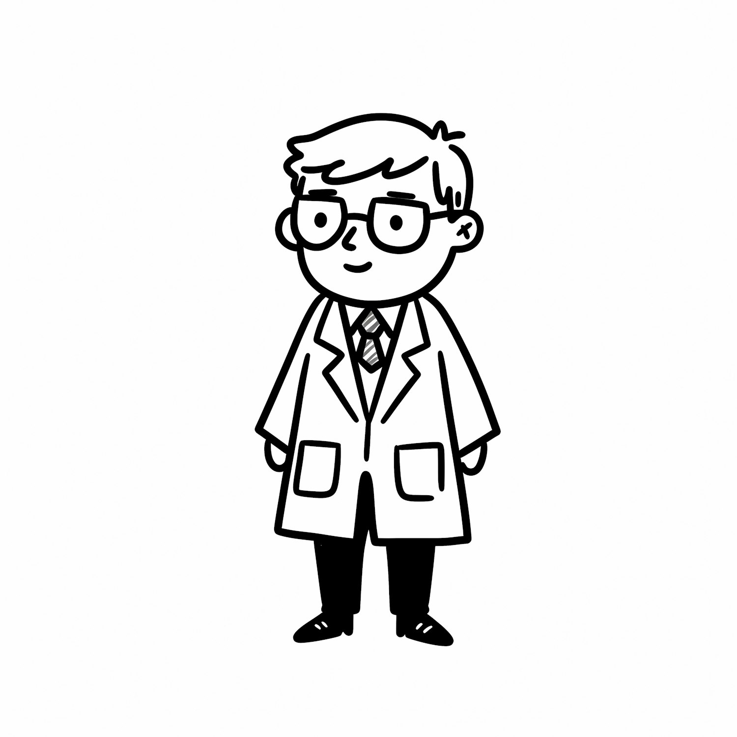 A cute cartoon scientist in a lab coat and glasses, drawn in a simple black-and-white style with a cheerful expression.