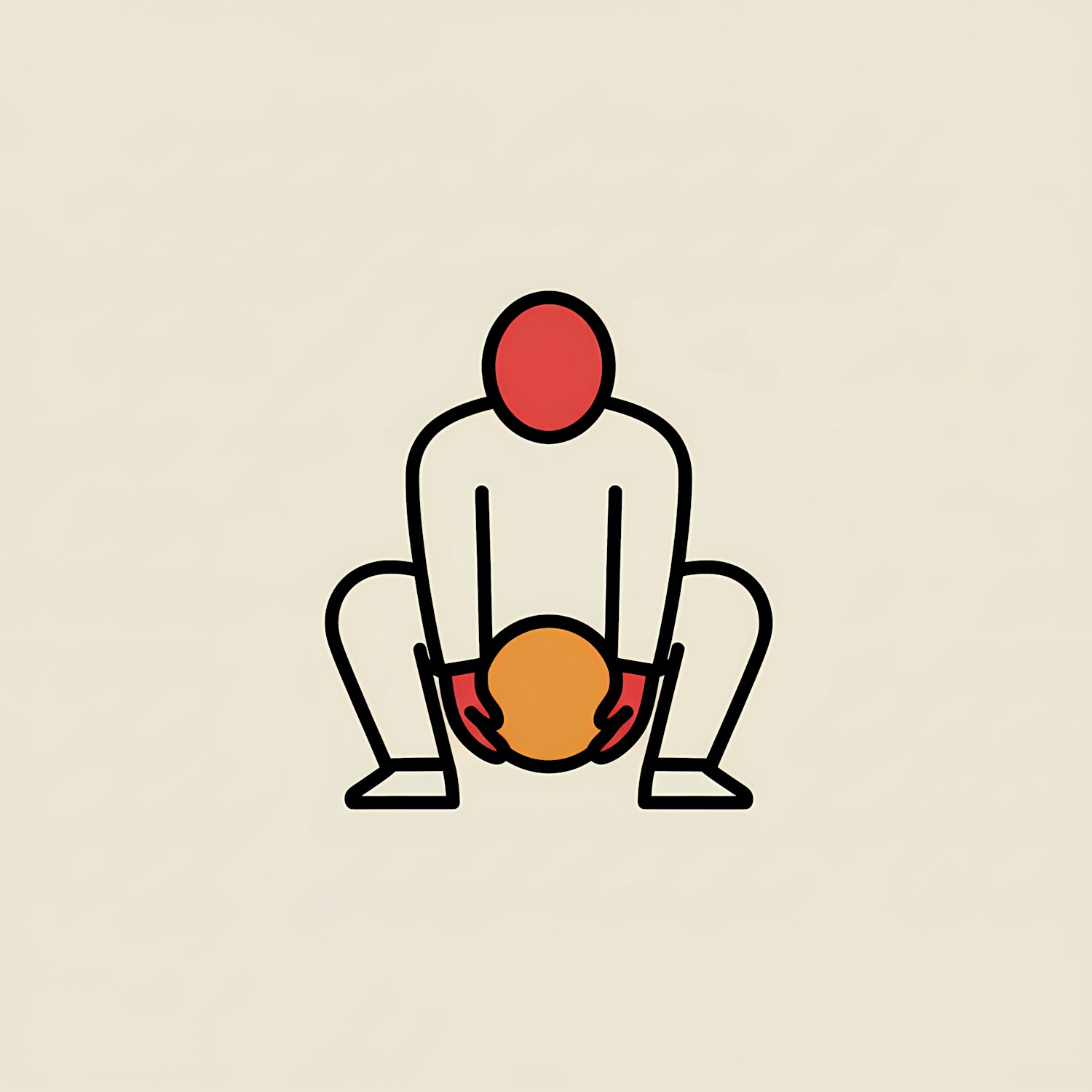 Minimalist illustration of a person squatting with an orange ball, featuring clean lines and a beige background.
