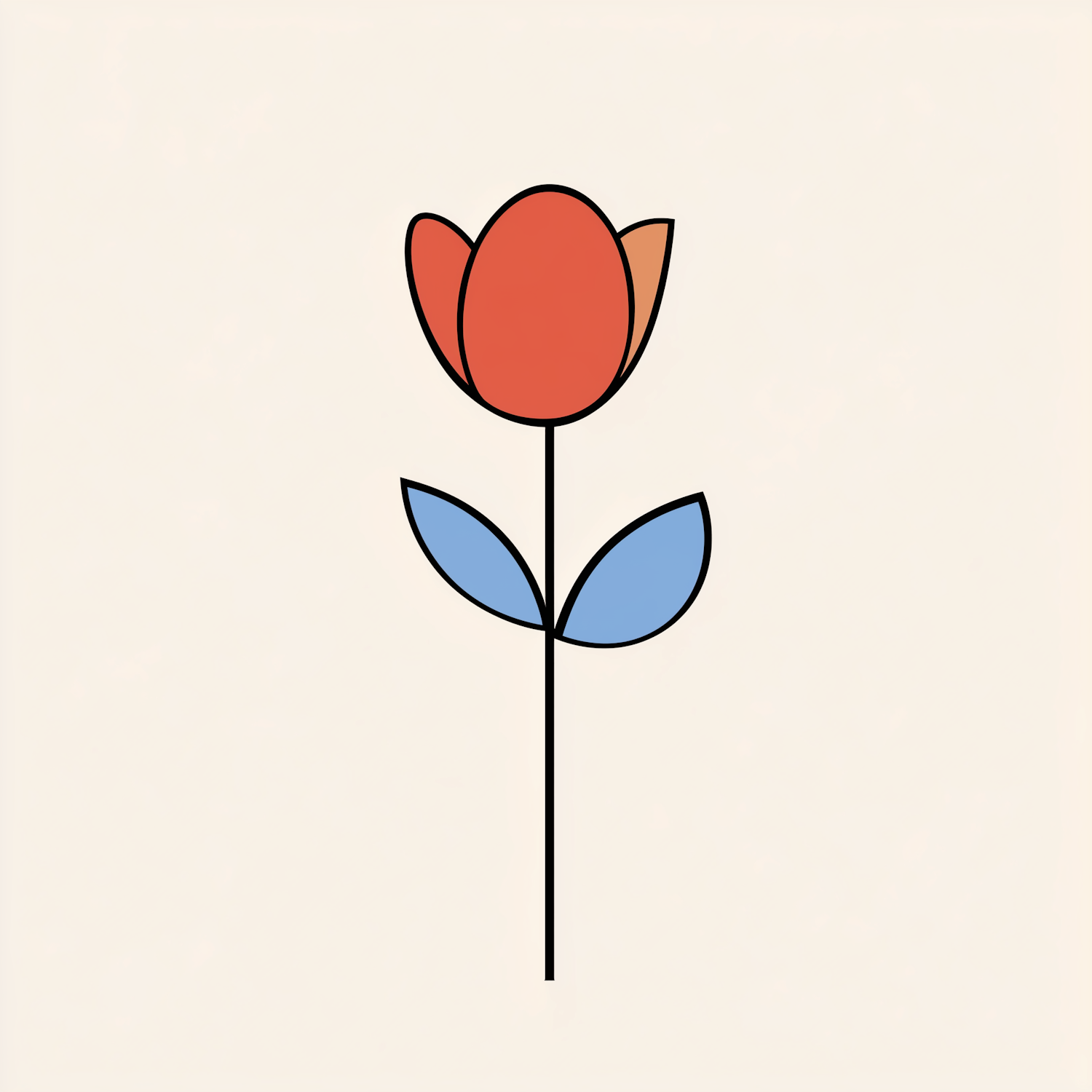 Minimalist flower illustration with red bloom, blue leaves, and beige background. Simple geometric design with bold colors.