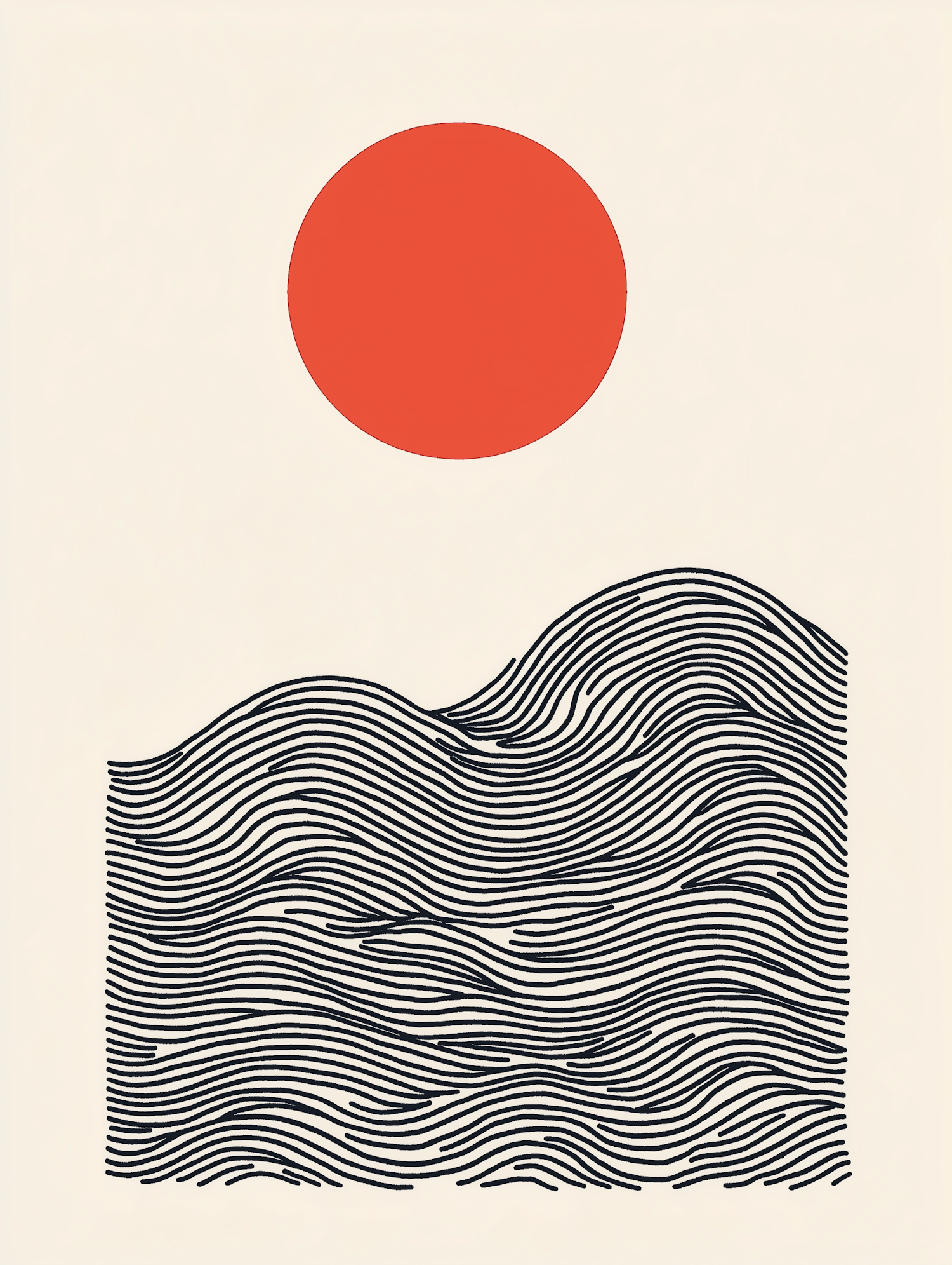 Minimalist illustration with a red sun and abstract black waves on an off-white background, creating a striking geometric design.