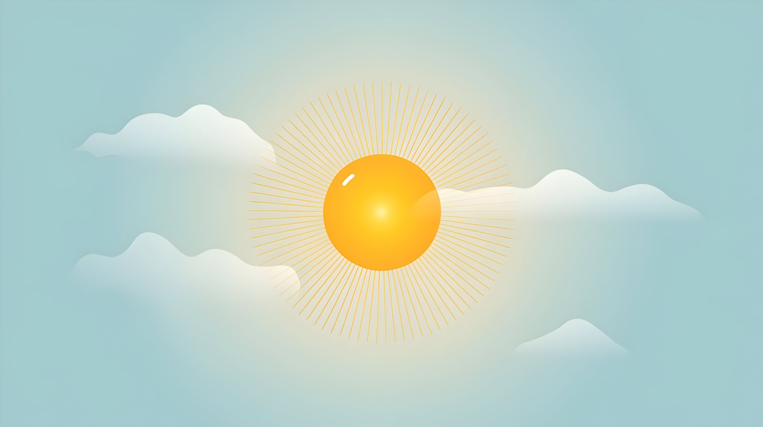Minimalist illustration of a bright sun with golden rays, fluffy clouds, and a soft blue gradient sky. Perfect for serene and sunny vibes.
