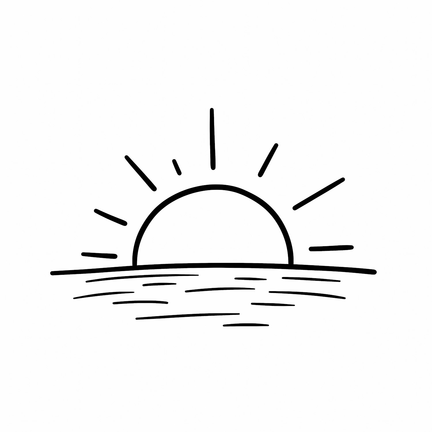 Minimalist black-and-white line art of a sunrise over the ocean, featuring clean lines and a serene design.