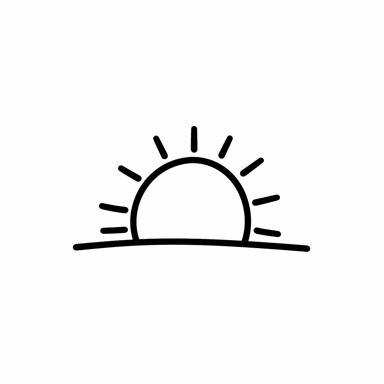 Minimalist black and white sunrise illustration with a semi-circle sun and radiating lines, symbolizing sunlight over a horizon.