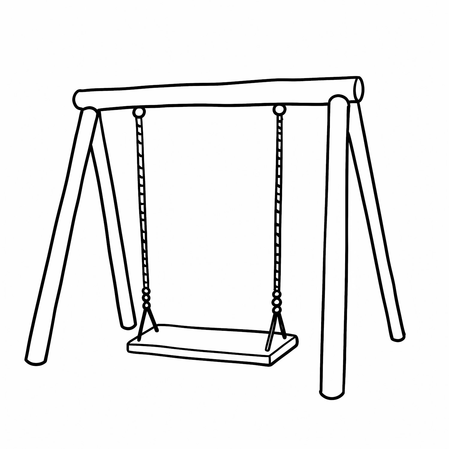 Minimalistic black-and-white line drawing of a swing set with a rectangular seat and A-frame support.