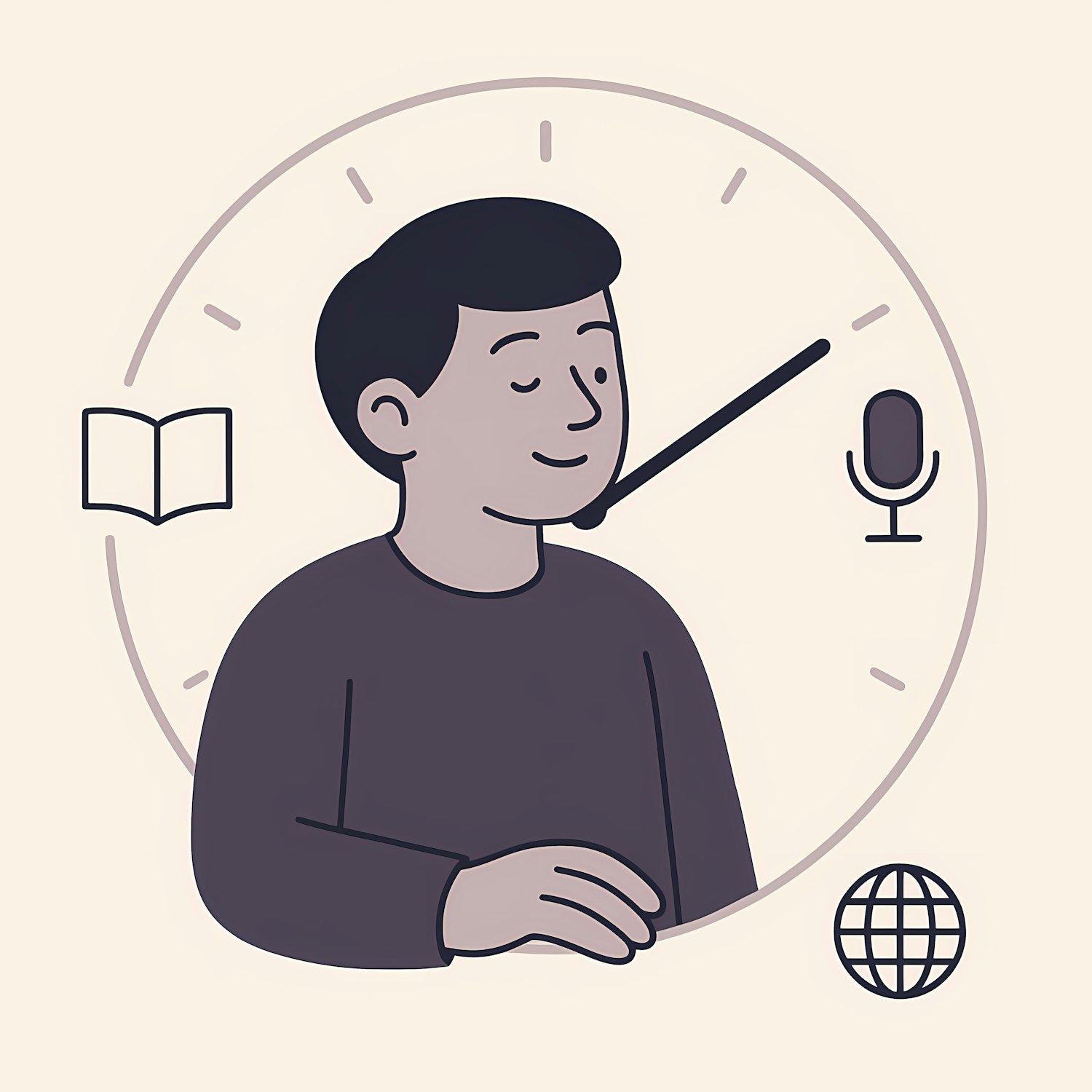 Minimalist illustration of a person with icons of a book, microphone, and globe, symbolizing learning, communication, and global connectivity.