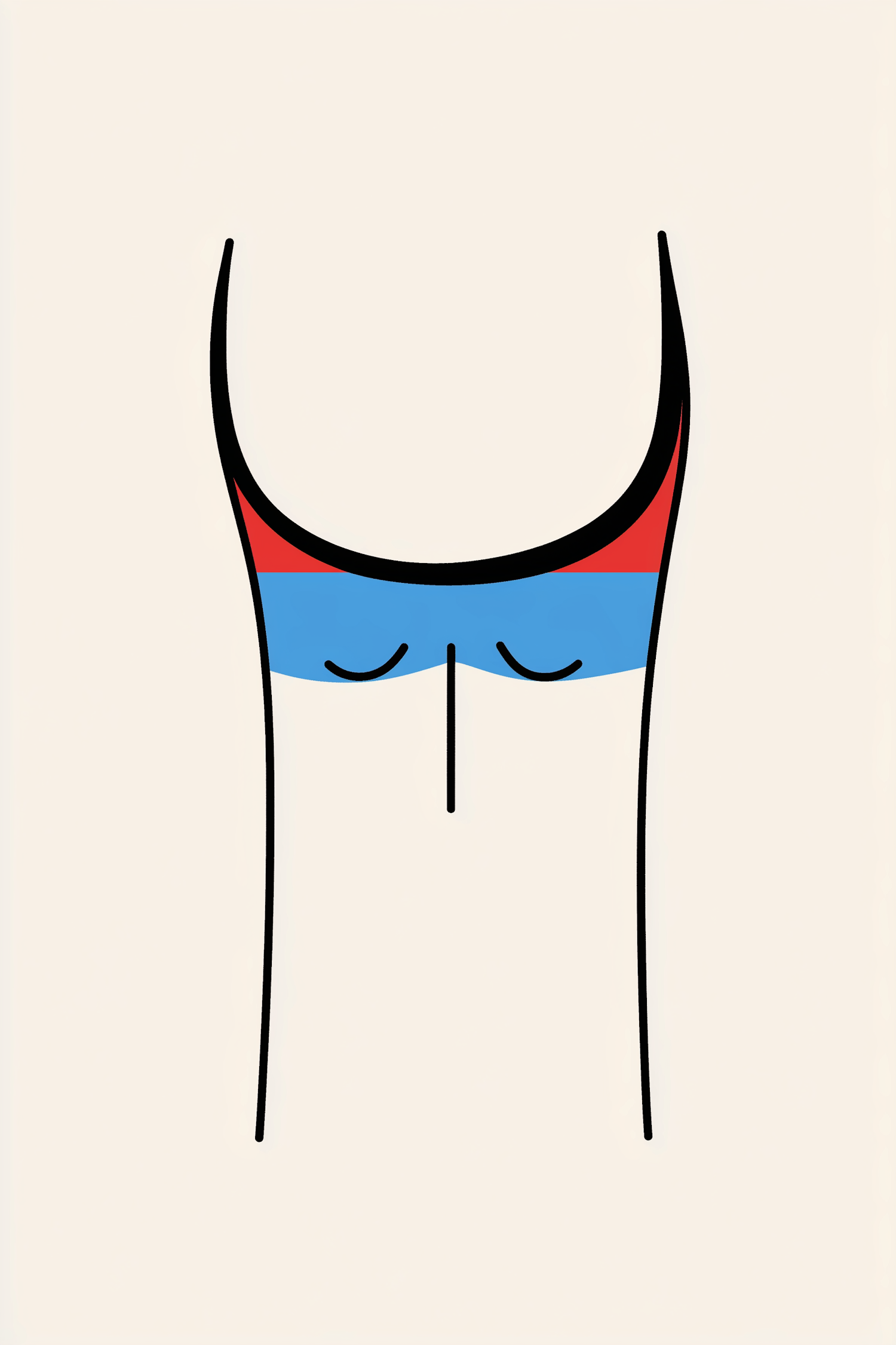 Minimalist illustration of a woman's torso with red and blue color blocks, resembling a bikini top, on an off-white background.