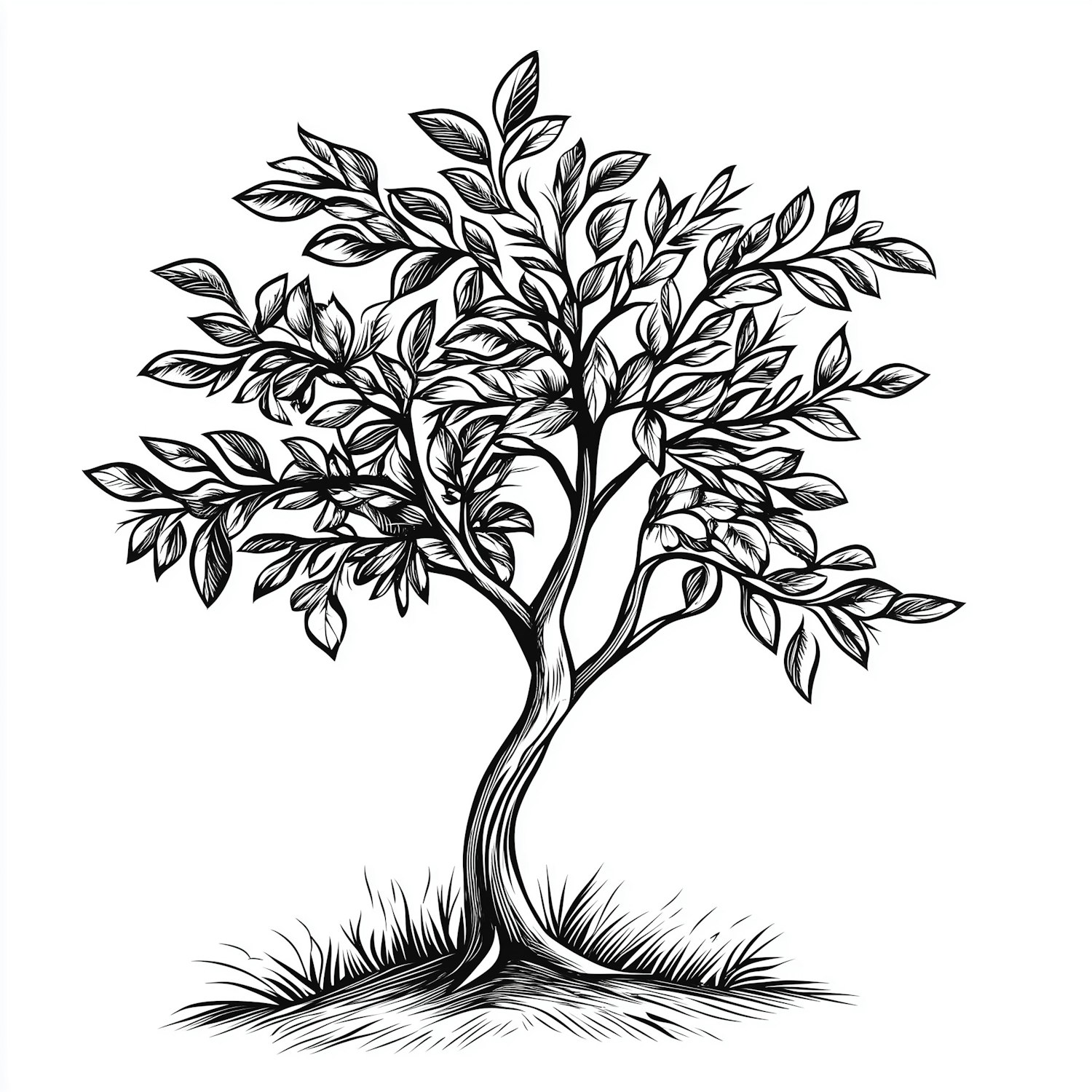 Detailed black-and-white line art of a tree with intricate leaves and a grassy base, perfect for nature-themed designs.