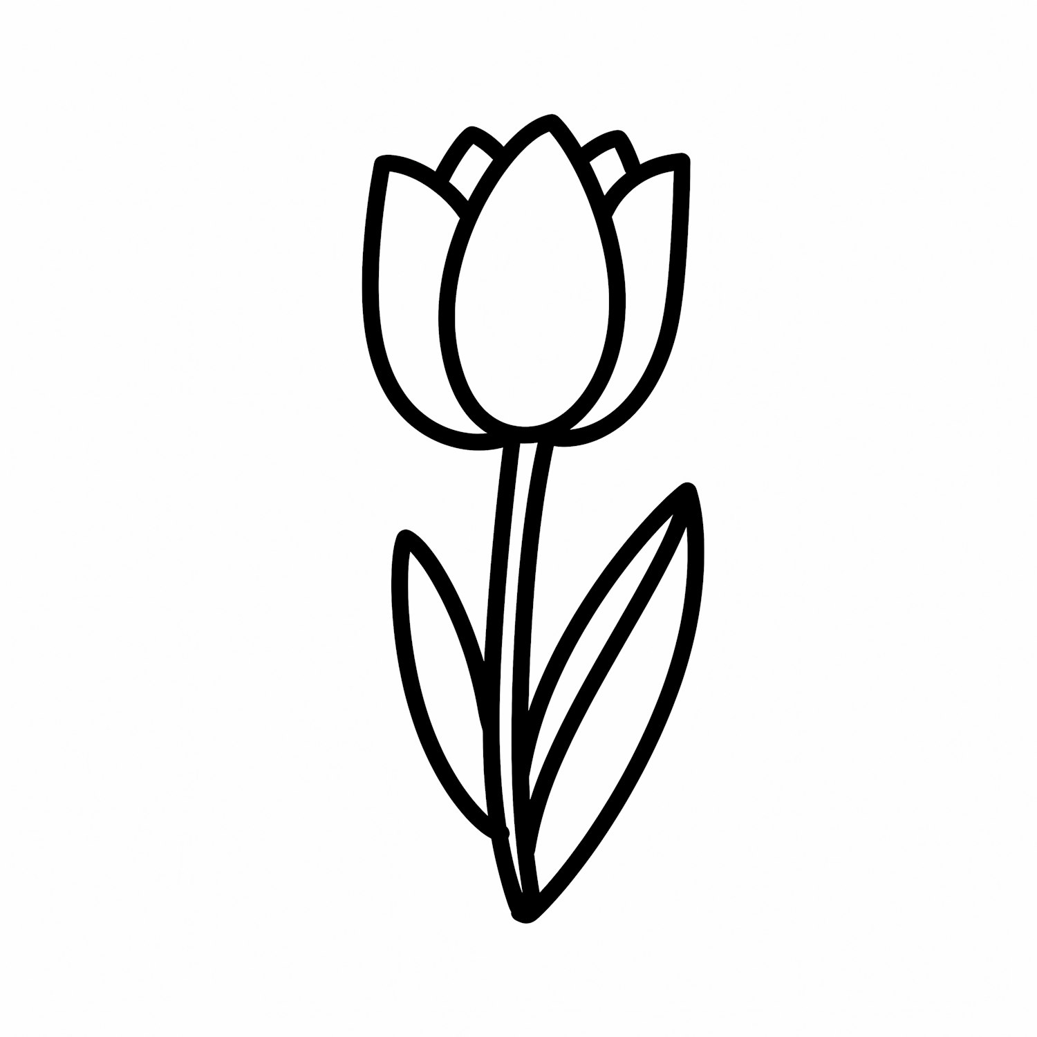Minimalist black-and-white line drawing of a tulip flower with a stem, two leaves, and a bulbous flower head.