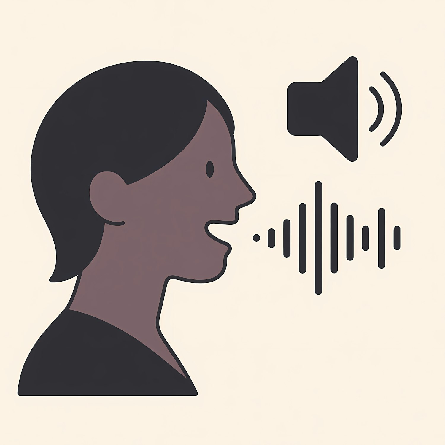 Minimalist illustration of a person speaking with sound waves and a speaker icon, symbolizing voice or audio communication.