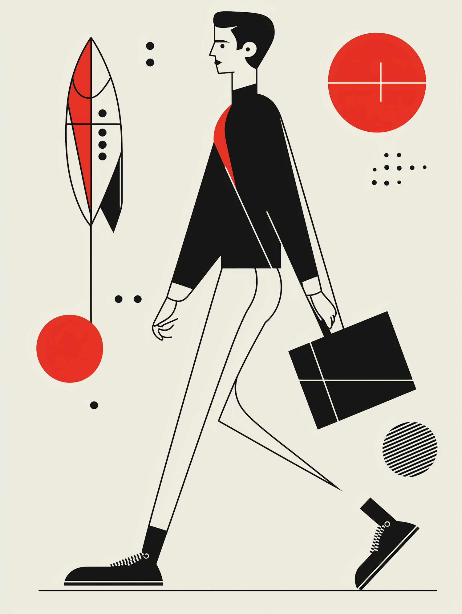 Minimalist illustration of a person walking with geometric shapes and a black-red color scheme, featuring abstract elements.