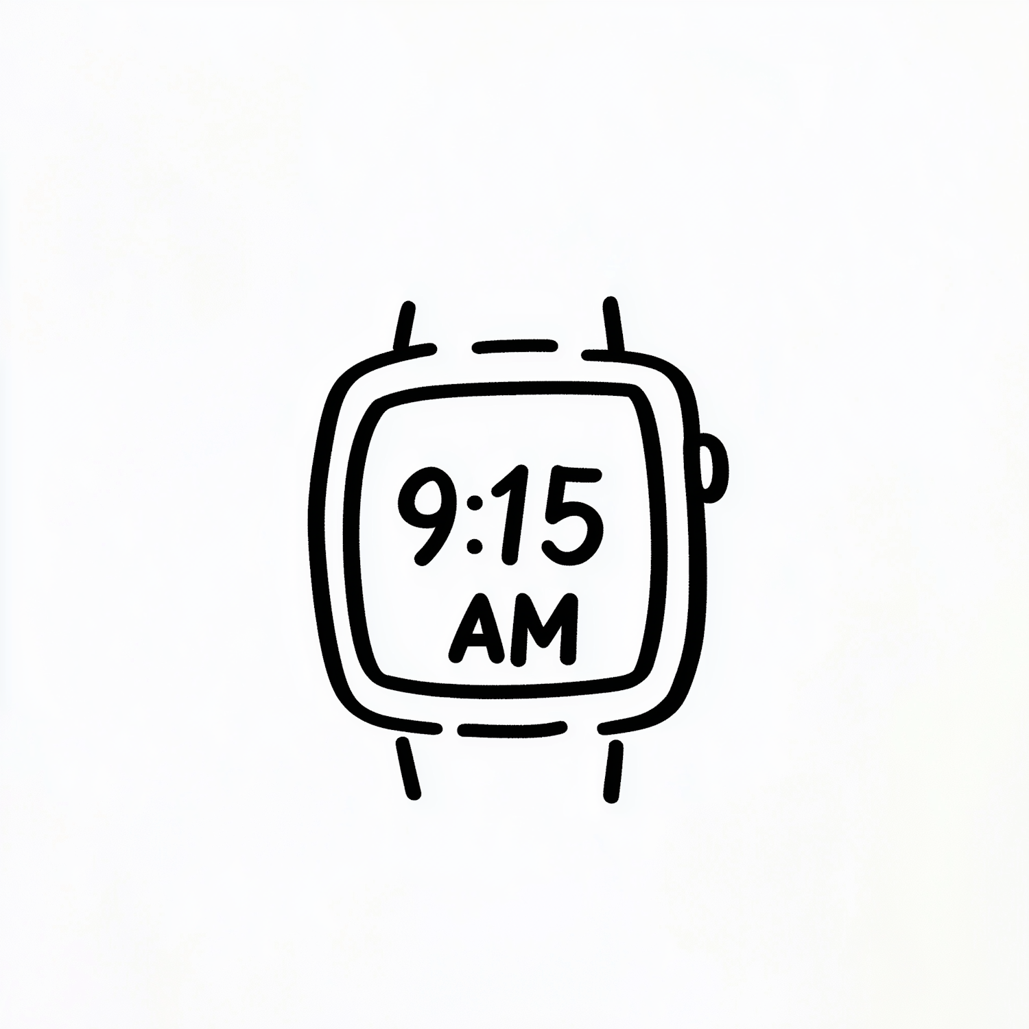 Minimalist black-and-white illustration of a digital wristwatch showing 9:15 AM, with a clean and modern design on a plain white background.