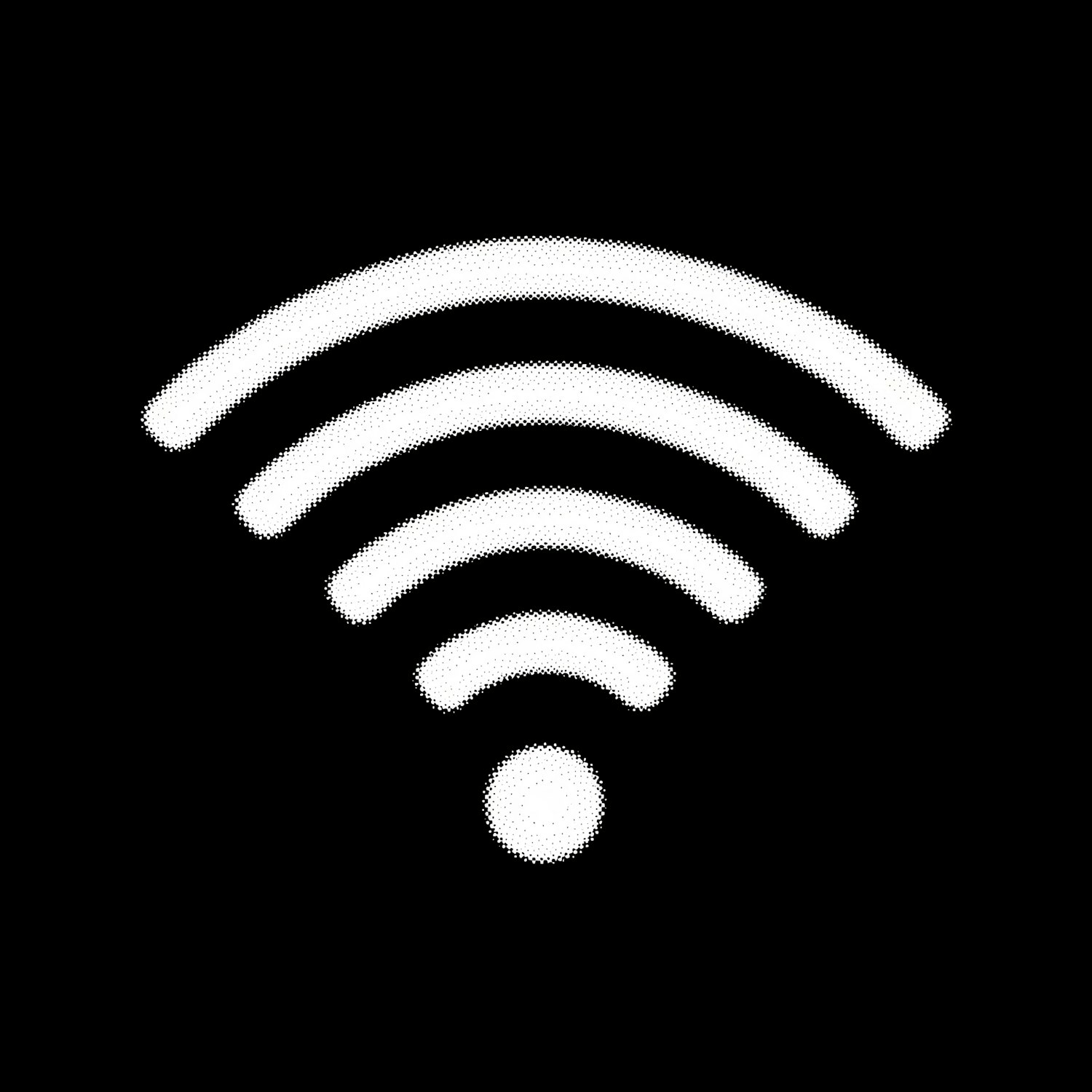 Minimalist Wi-Fi symbol in white on a black background, representing wireless connectivity and internet access.