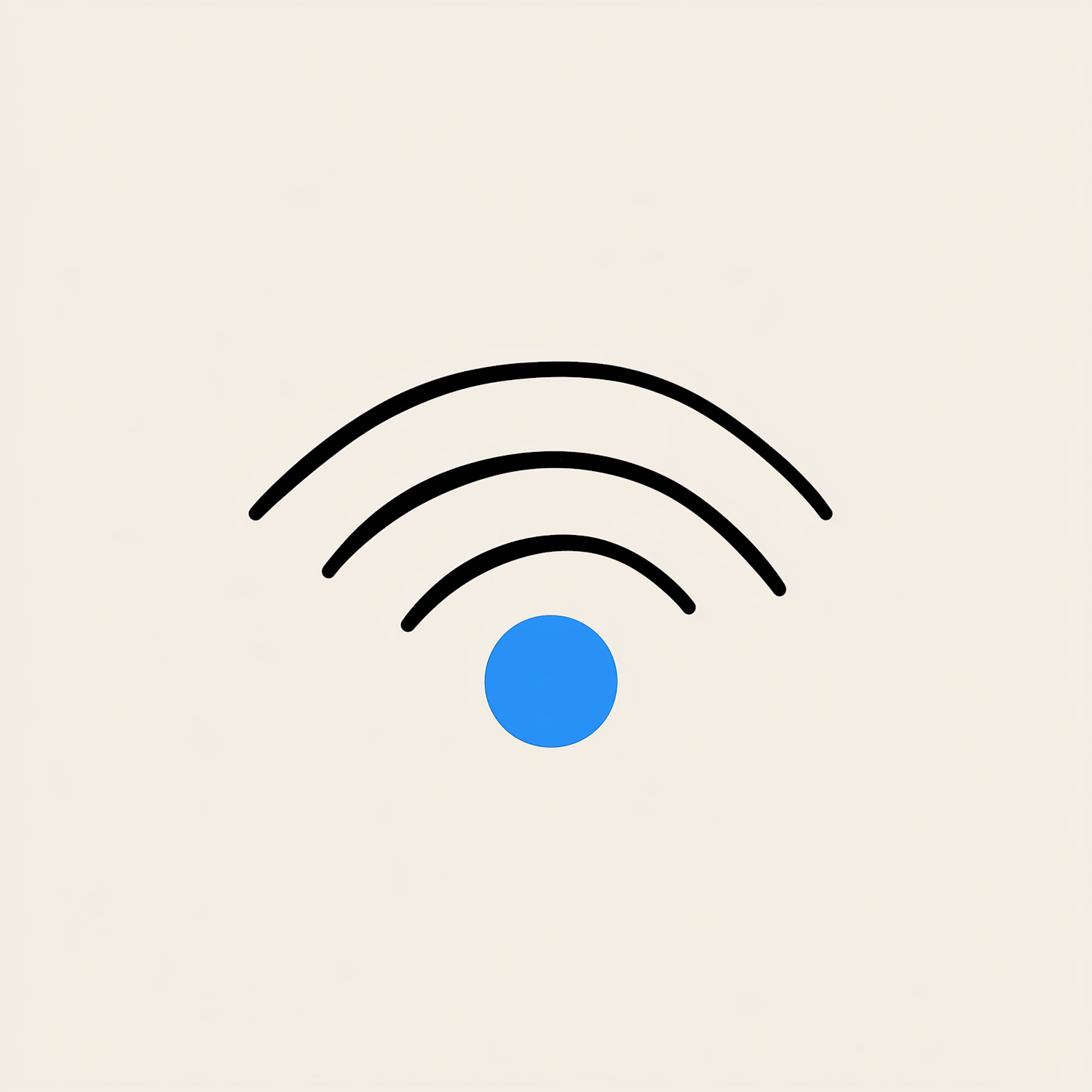 Minimalist Wi-Fi symbol illustration with black lines and a blue dot on a beige background, representing wireless connectivity.