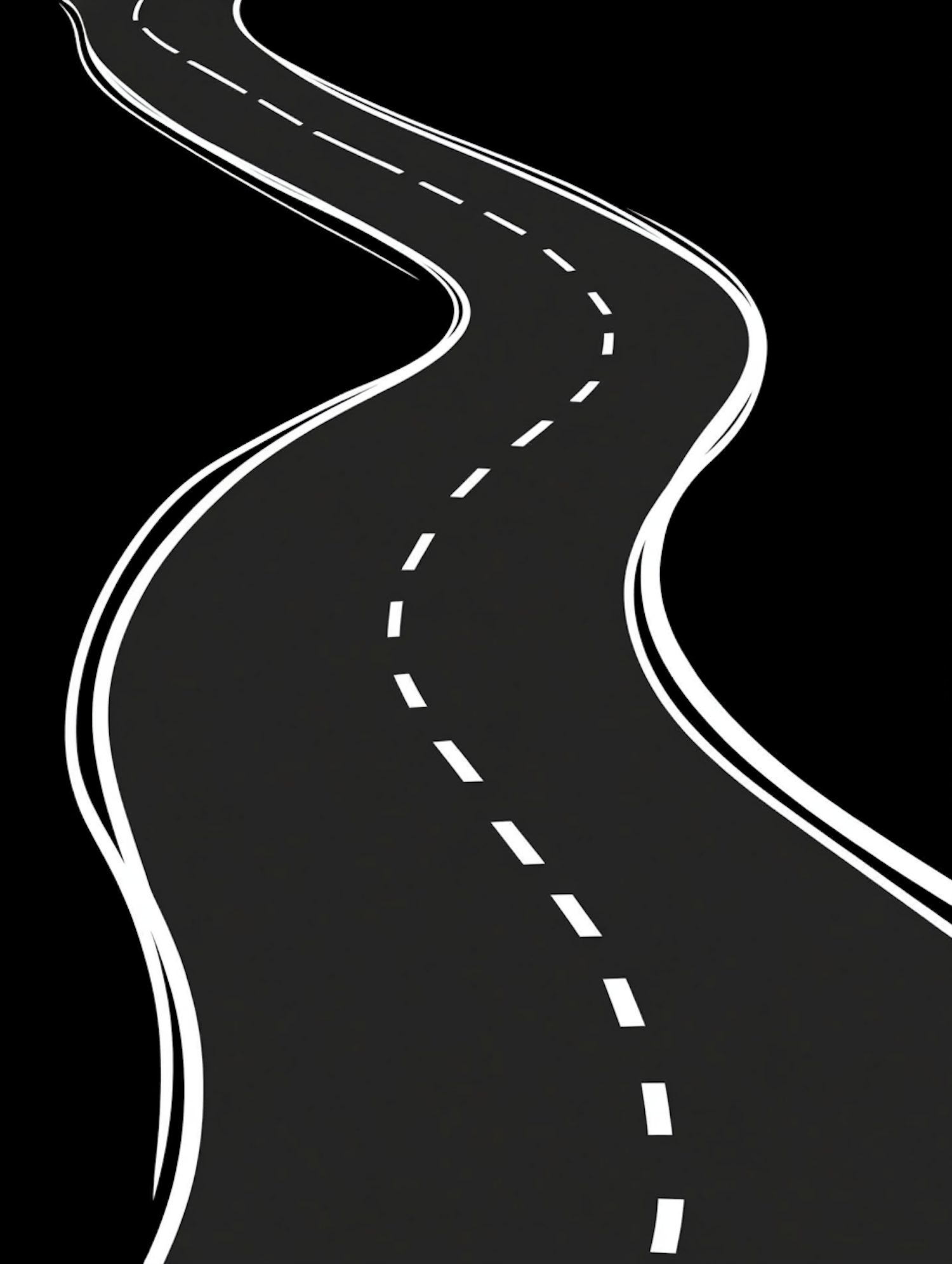 Minimalist winding road illustration with white dashed and solid lines on a black background, emphasizing curves and simplicity.