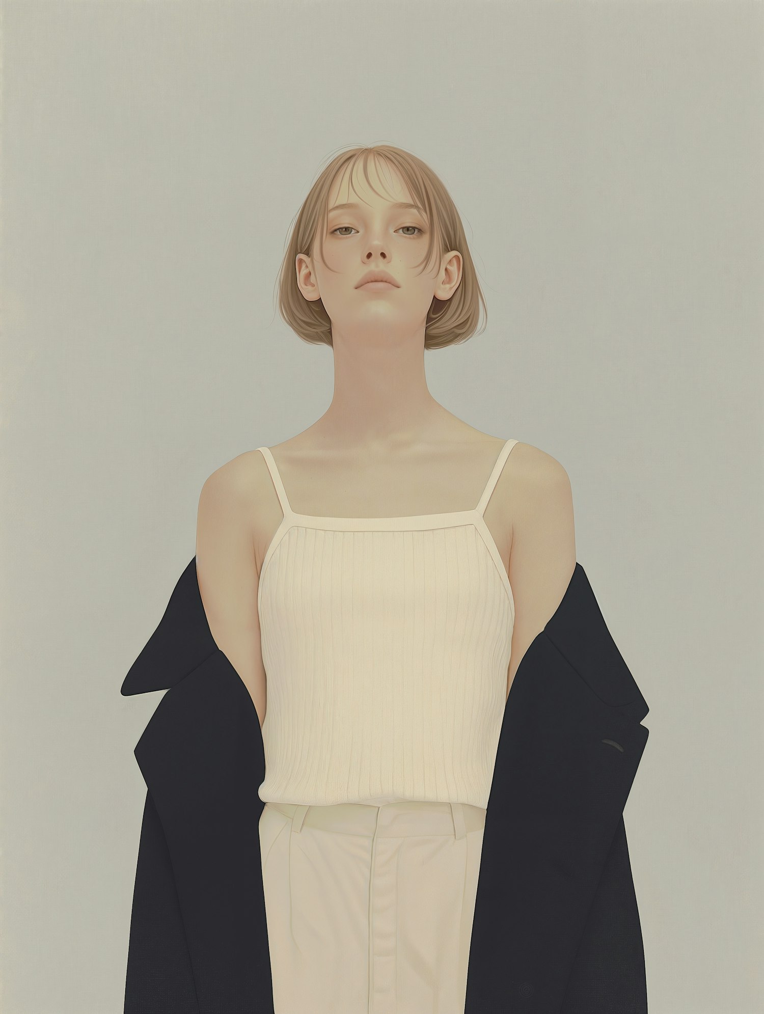 Minimalist illustration of a young woman in a white tank top, cream trousers, and a black coat, set against a muted gray background.